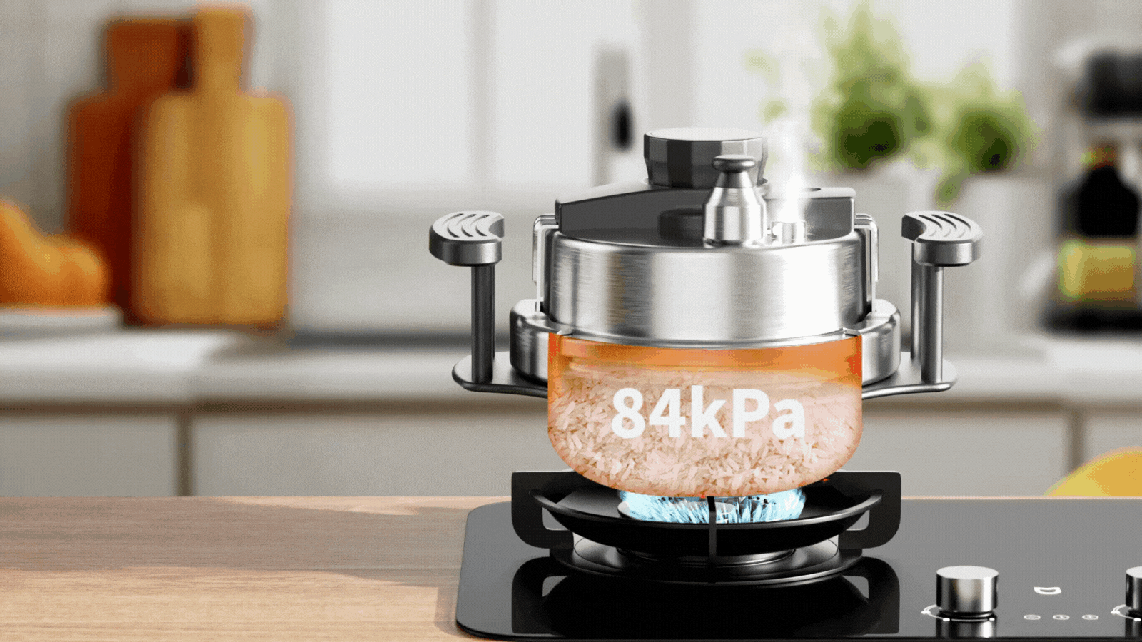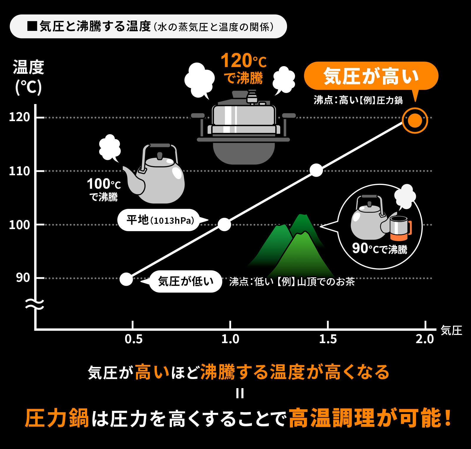 沸点が100℃から5℃上がると調理時間は30%短縮され、さらに120℃まで上がると半分ほどの時間まで短縮されます。これが圧力鍋で時短調理ができる理由です。