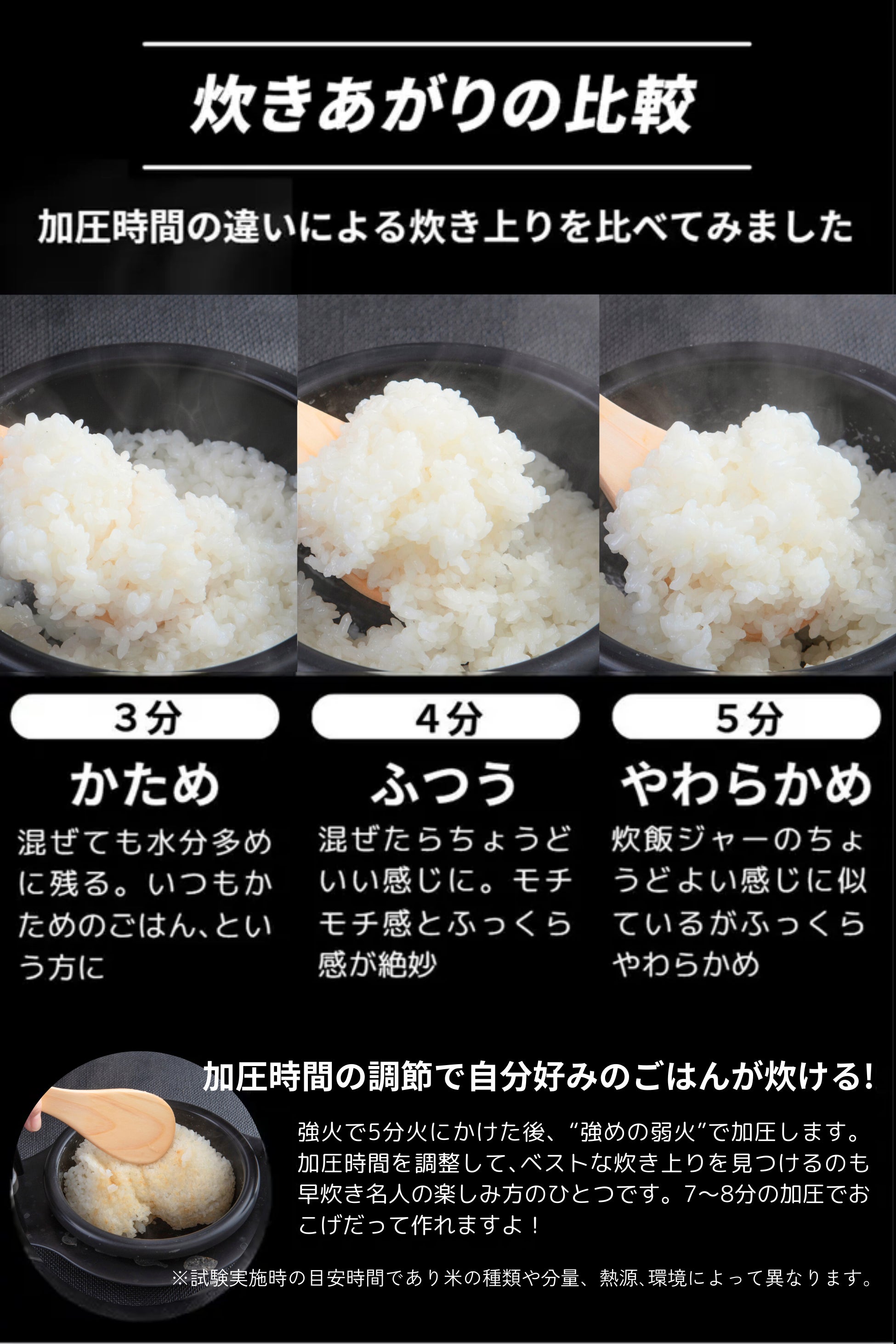 ・・・不安ですよね?早炊き名人は、圧力鍋をヒントにしています。圧力鍋と同じ理論で炊きあげるから大丈夫!むしろ、美味しく炊けるんです。