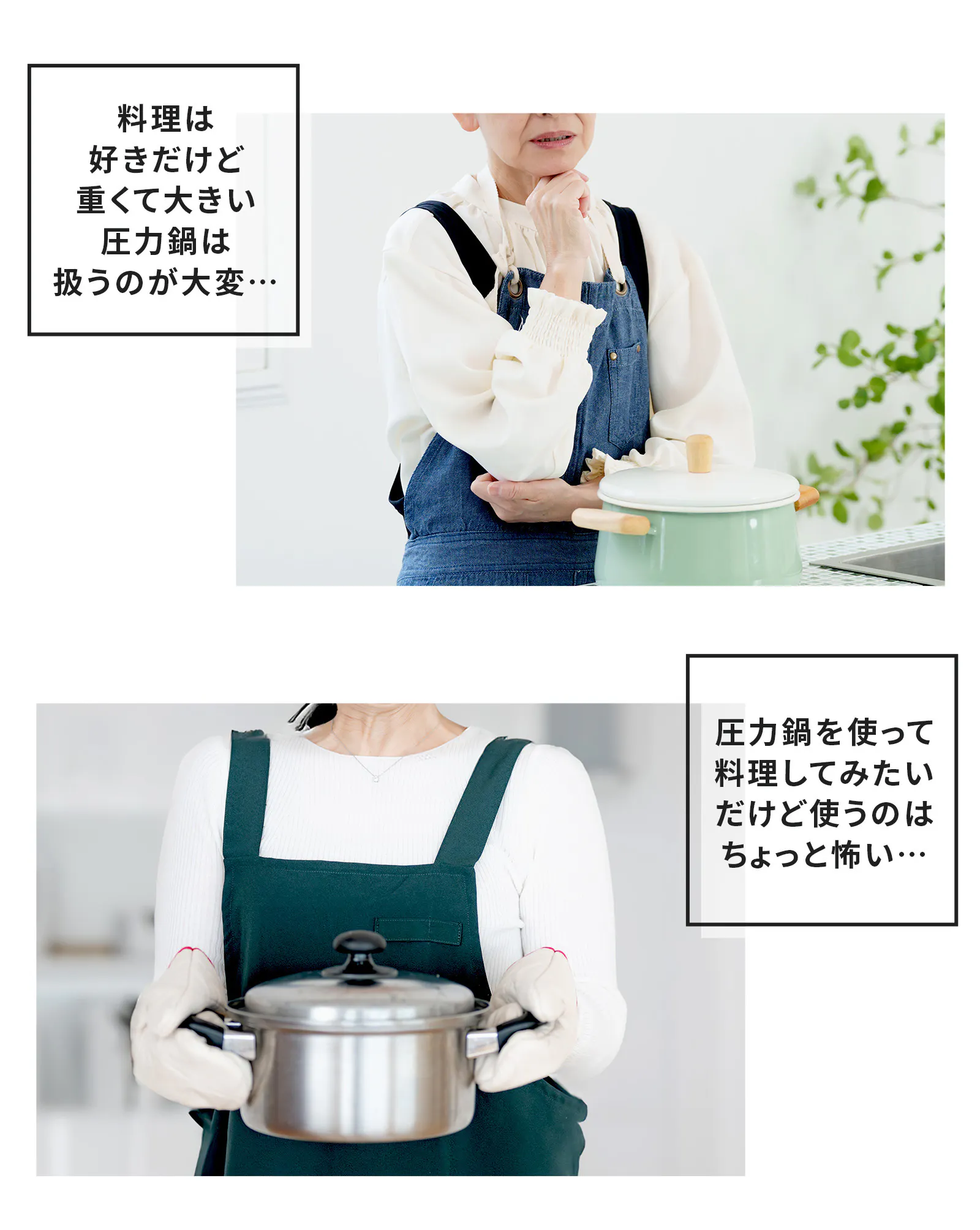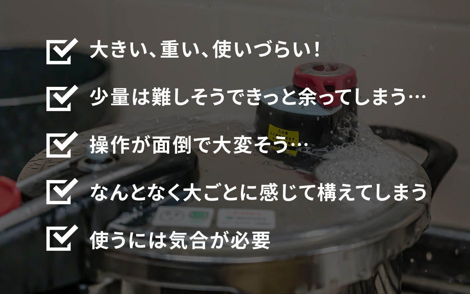 メリットはいろいろあるのに、気軽に毎日使うには圧力鍋はなかなか敷居が高いと感じる方も多いようです。おひとりさまや、お子様が巣立ってご夫婦お二人なんて方なら尚更。少量のお料理にはあんまり向いてないという声も・・・。