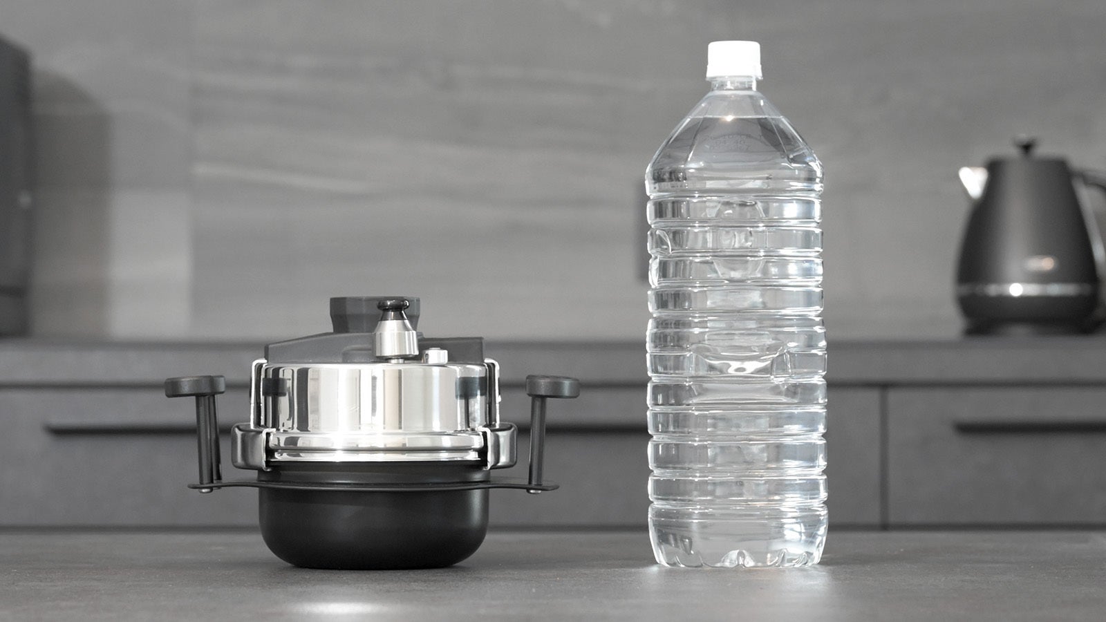早炊き名人は約1.4kg。1.5Lペットボトルよりも軽い!両手におさまるサイズと軽さを実現しています。大きく重たい圧力鍋は棚から取り出すのもひと苦労ですが、早炊き名人なら毎日使っても苦に感じません。