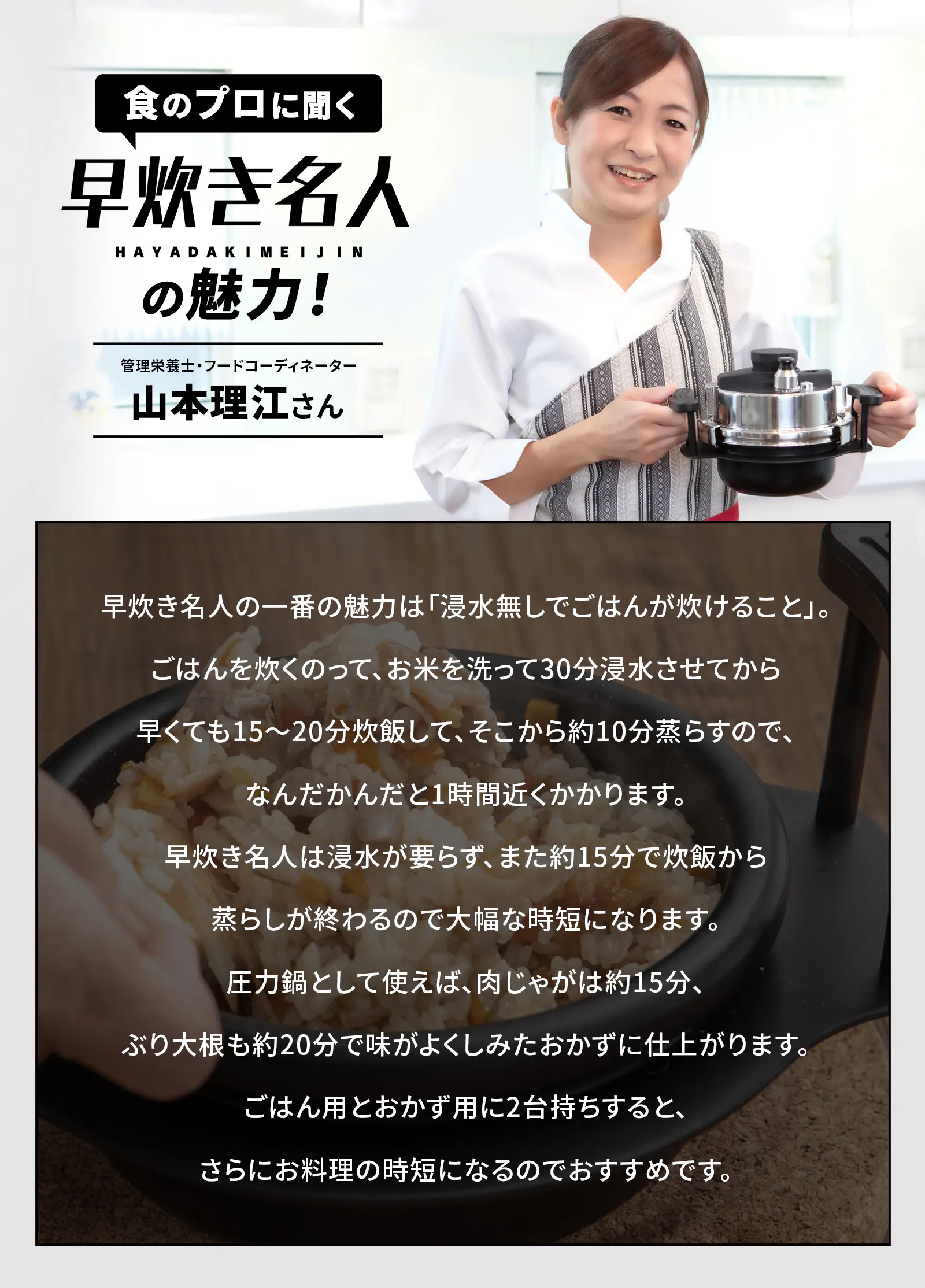 毎日食べるご飯だから“ただ食べる”のではなく、「美味しさ」も「食べるよろこび」も大切にしたいのに、「忙しい」「時間がない」となってしまっている方にこそ使ってもらいたい早炊き名人。