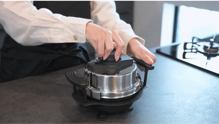 ピンが上がっている時、釜の中は加圧中でロックしている状態。蓋は開けられません。火を止めて5~6分でピンが下がり、蓋が開けられるようになります。