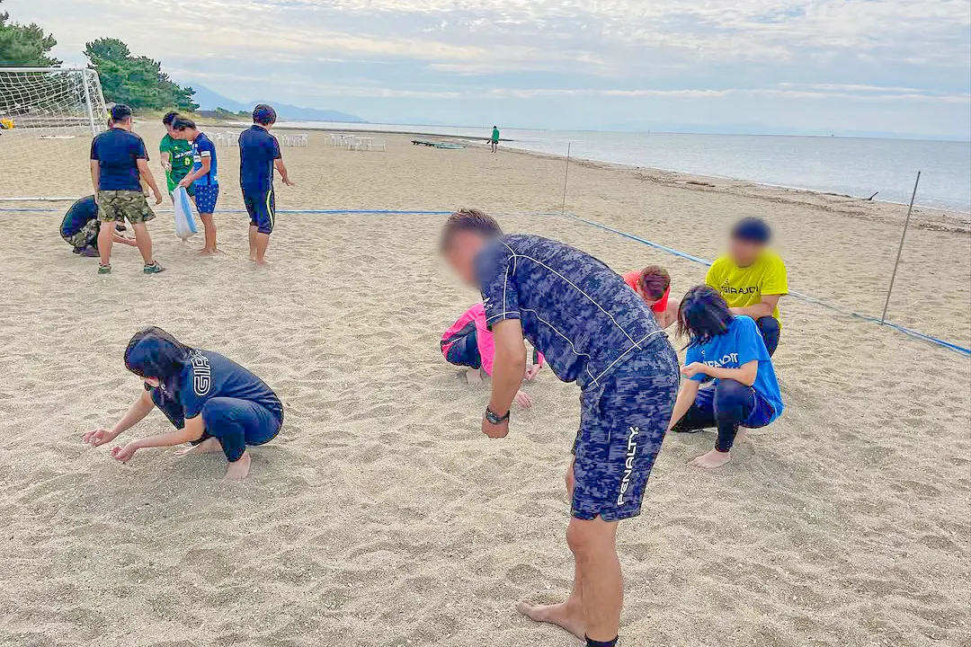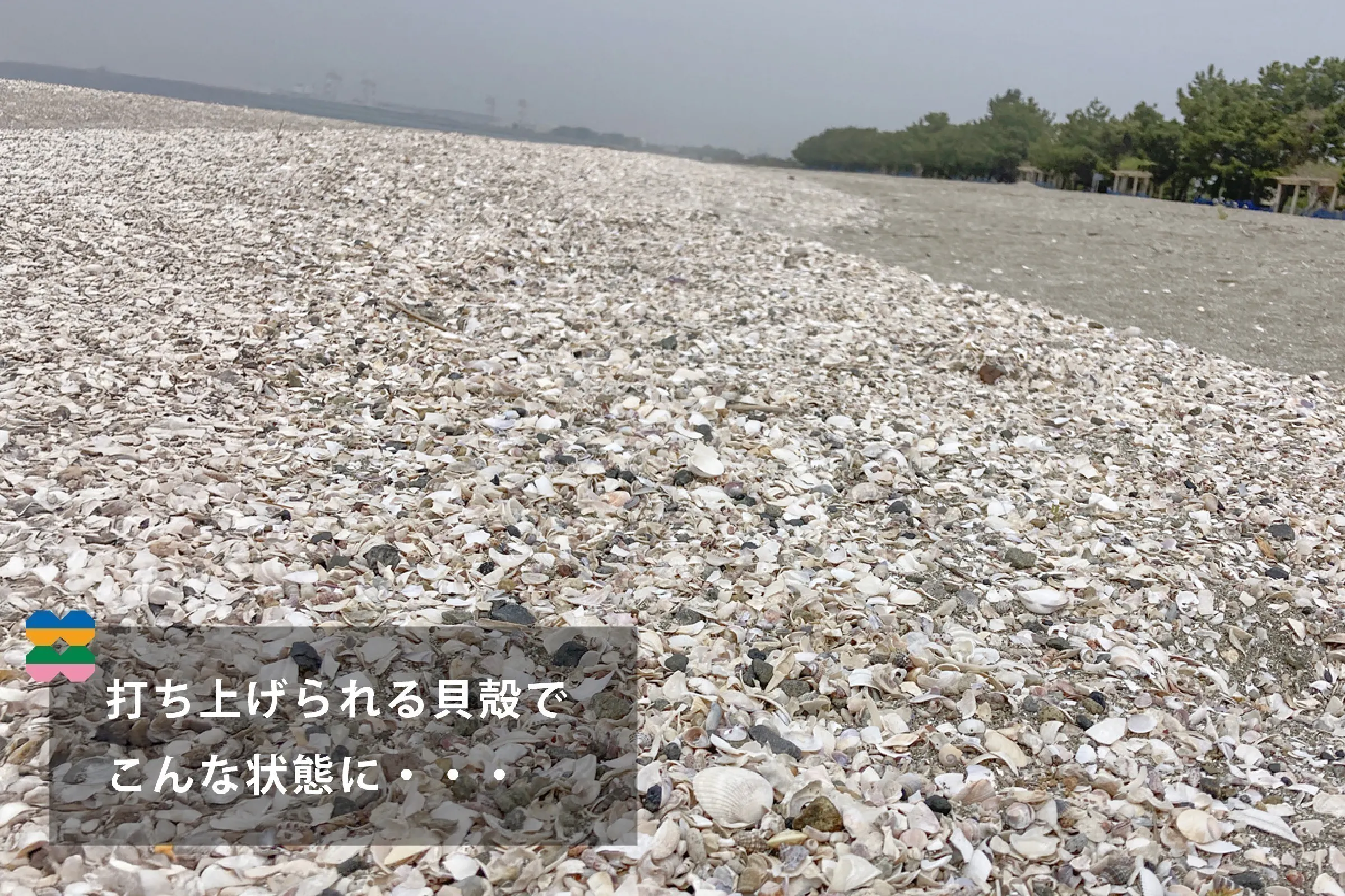 波に打ち上げられ蓄積した貝殻が砂浜に混ざり込み、子どもたちは靴を履いて遊ばざるを得ない状況。ビーチスポーツも本来の楽しさを十分に体験できない状態でした。