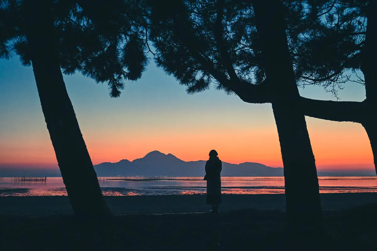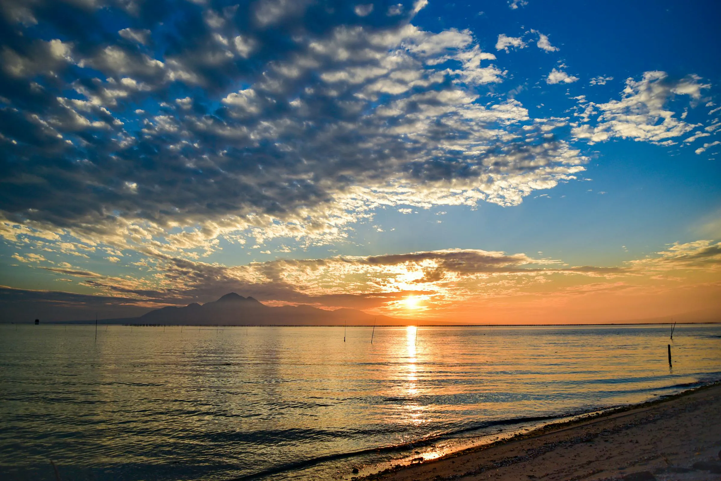 有明海に沈む真っ赤な夕日。対岸に見える雲仙普賢岳の雄大な姿。どこまでも続く砂浜。