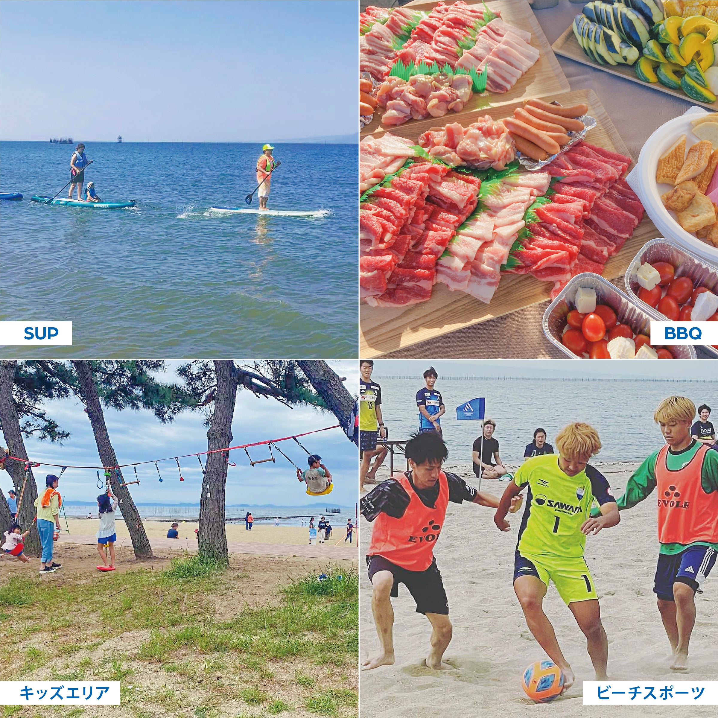ビーチアクティビティ:どこまでも続く砂浜で、SUPなどのマリンアクティビティや、ビーチサッカー・ビーチバレーの利用も盛ん。最近では珍しい地引網体験や、小さなお子様の磯遊びも楽しめます。