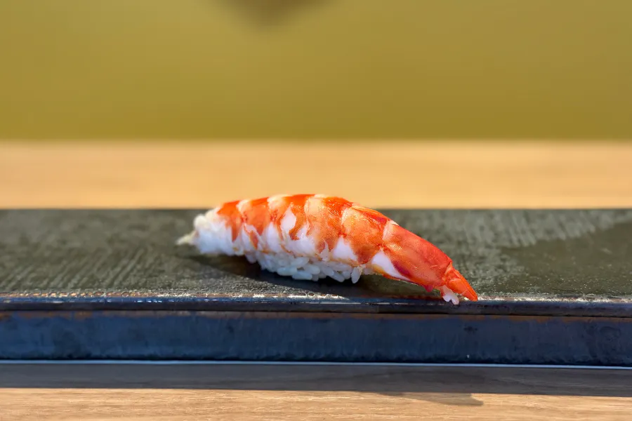 紅白の色合いが美しく、古来より縁起物とされる一貫。鮮度のよい車海老をさっと火入れすることで、繊細な甘みと旨みを引き立たせます。噛みしめるたびに、自然の恵みがじんわり広がります。