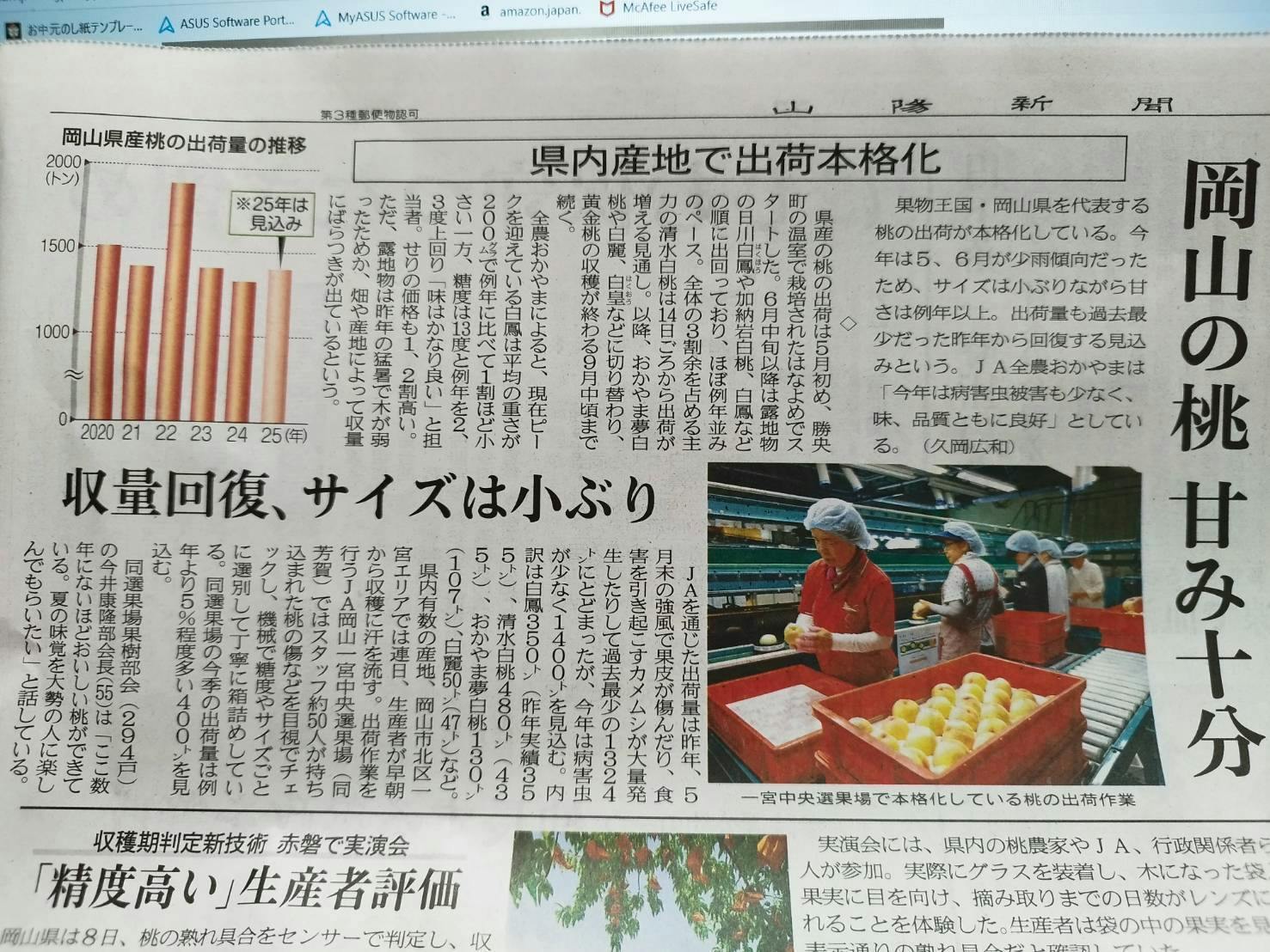 今年は少雨の影響で小玉傾向ですが、糖度が高い仕上がりになっています。本日の山陽新聞の記事にも記載されていますが、1割ほど小さい一方、糖度は2度~3度高くなっています。