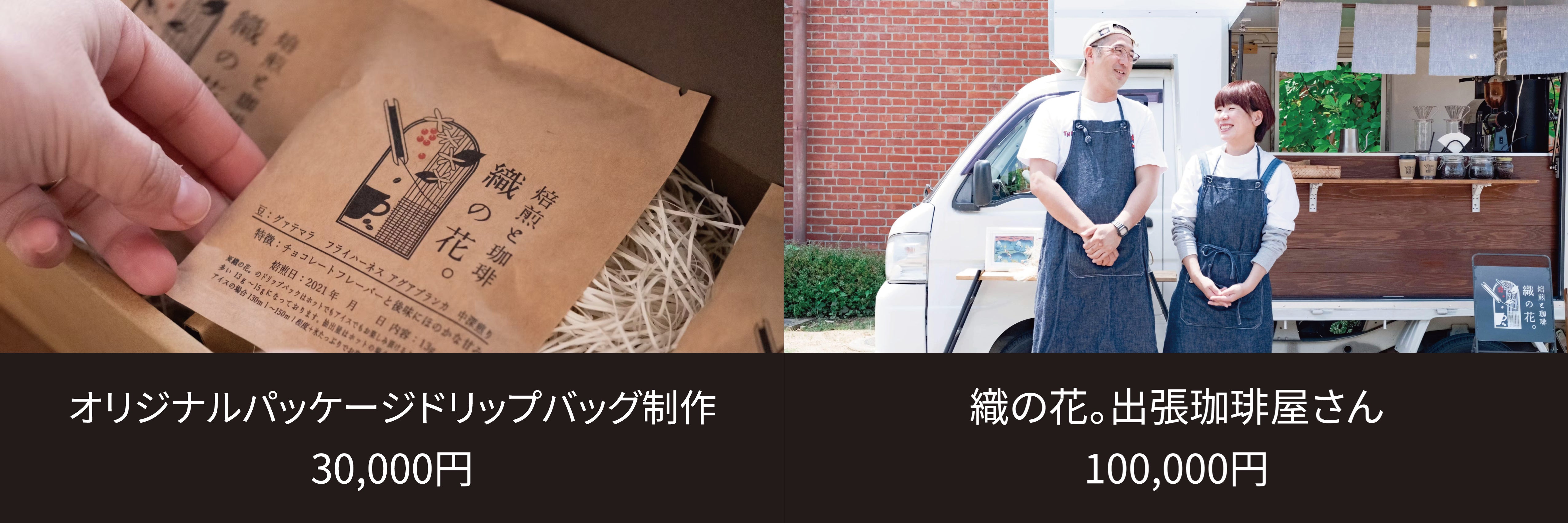 法人様・店舗様向けのおすすめリターンです。ノベルティや周年記念品、お客様へのお渡し用のオリジナルパッケージでのドリップバッグ制作、またイベントや社内行事にキッチンカーでお伺いし、淹れたての珈琲をご提供する出張珈琲屋さん。「織の花。」の珈琲を、ブランドPRやお客様へのおもてなしにご活用ください。