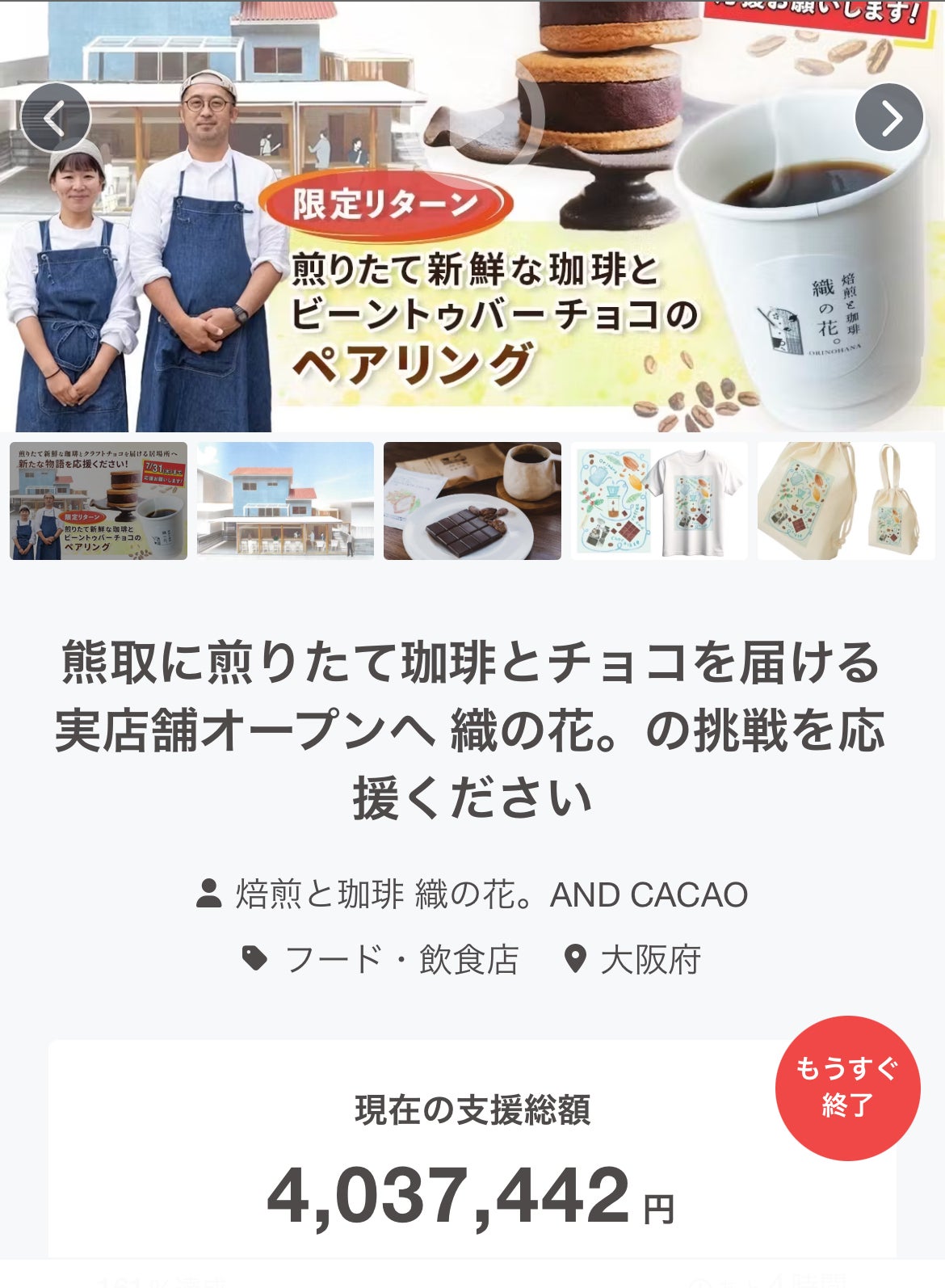 2025/08/01 01:40たくさんの応援を本当にありがとうございました。焙煎と珈琲 織の花。AND CACAOです。6月25日にスタートした織の花。のクラウドファンディング。先ほど、7月31日23:59をもって、無事に終了いたしました。まずはこの約1か月間、織の花。の挑戦を見守ってくださり、応援し支えてくださったすべての皆さまへ心の底からありがとうございました。どれだけ感謝の気持ちを伝えても足りないくらいです。わたしたち夫婦にとって、初めてのクラウドファンディング。やるか、やらないか、夫婦で何度も話し合い、プラスのことも、ネガティブなことも両方の面も調べては立ち止まり、けど、最終的にはやると決め、そのために一生懸命準備を進めたものの、けど、やっぱり不安な気持ちは消えないままのスタートでした。けれど、そんな不安いっぱいの私夫婦の背中を押してくださったのはスタート直後から寄せられた、皆様からのたくさんの応援でした。開始からわずか数日で、第一目標だった「ファーストゴール」に到達。一時は全国のクラファンサイトで総合1位にまでなり、驚きと感謝で胸がいっぱいになりました。昔からの友人たち、親戚たち、お店を始めてから出会った心強い仲間たち、そして、クラファンの投稿をシェアし、広げてくださった大切なお客さま。そしてそっと見守ってくださった方々、とにかくここまでこれたのは応援し支えてくださった全ての皆様のおかげです。リターンを選んでくださったこと、あたたかいコメントをくださったこと、投稿をみて見守ってくださったこと、そのひとつひとつ全てが私たちの心の支えであり胸に深く届いています。最終的に頂いた支援はファーストゴールを大きく上回る417名、4,190,442円。その数字のひとつひとつに、どれほど多くの想いとエール、愛情が込められていたか。言葉では言い尽くせないほど感動しています。こんなにもたくさんの応援をいただいたこと、そして、ここまでの道のりを歩んでこれたこと。この経験はクラファンという挑戦をしなければきっと味わうことはできなかったと思います。そして、クラファンの性質上、まだお一人おひとりにきちんとお礼ができていないことを心苦しく思っておりますが、これから少しずつ、感謝の気持ちをお返ししていきたいと思っています。どうかお時間をいただけたら嬉しいです。今後は皆さまからお預かりした大切な想いを胸に、さらにわたしたちは実店舗の完成へと、歩みを進めていきます。お店の完成はこの冬を予定です。ひとつひとつの工程を大切にしながら、皆さんの想いを形にできるよう、心を込めて準備を進めてまいります。どうかこれからも、あたたかく見守っていただけたら嬉しいです。この1か月間でいただいた想いを忘れずに、これからの織の花。を夫婦ふたりでしっかりと育てていきます。最後にもう一度。応援してくださったすべての皆さまへ。本当に本当にありがとうございました。焙煎と珈琲 織の花。AND CACAO もっと見る