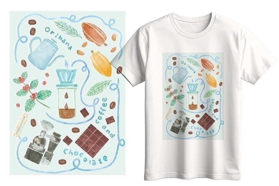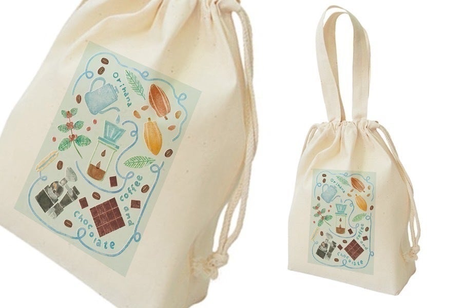 紙版画作家・中原みおさんによる描き下ろしデザイン。珈琲豆、カカオポッド、ドリッパー、焙煎機——「織の花。」が大切にしている、珈琲とチョコレートの世界を一枚の絵に込めました。