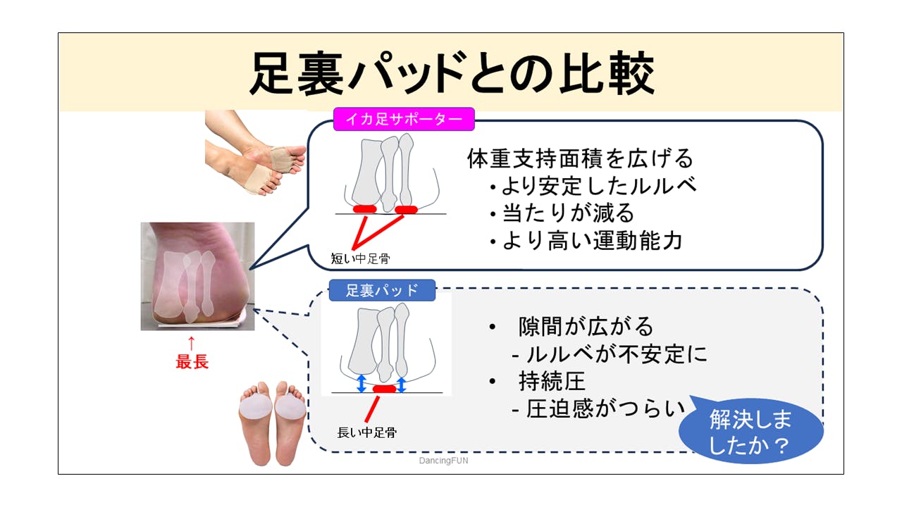 一方、「イカ足サポーター」では、短い中足骨の下にシリコン・パッドを当てるので、下記の利点があります。