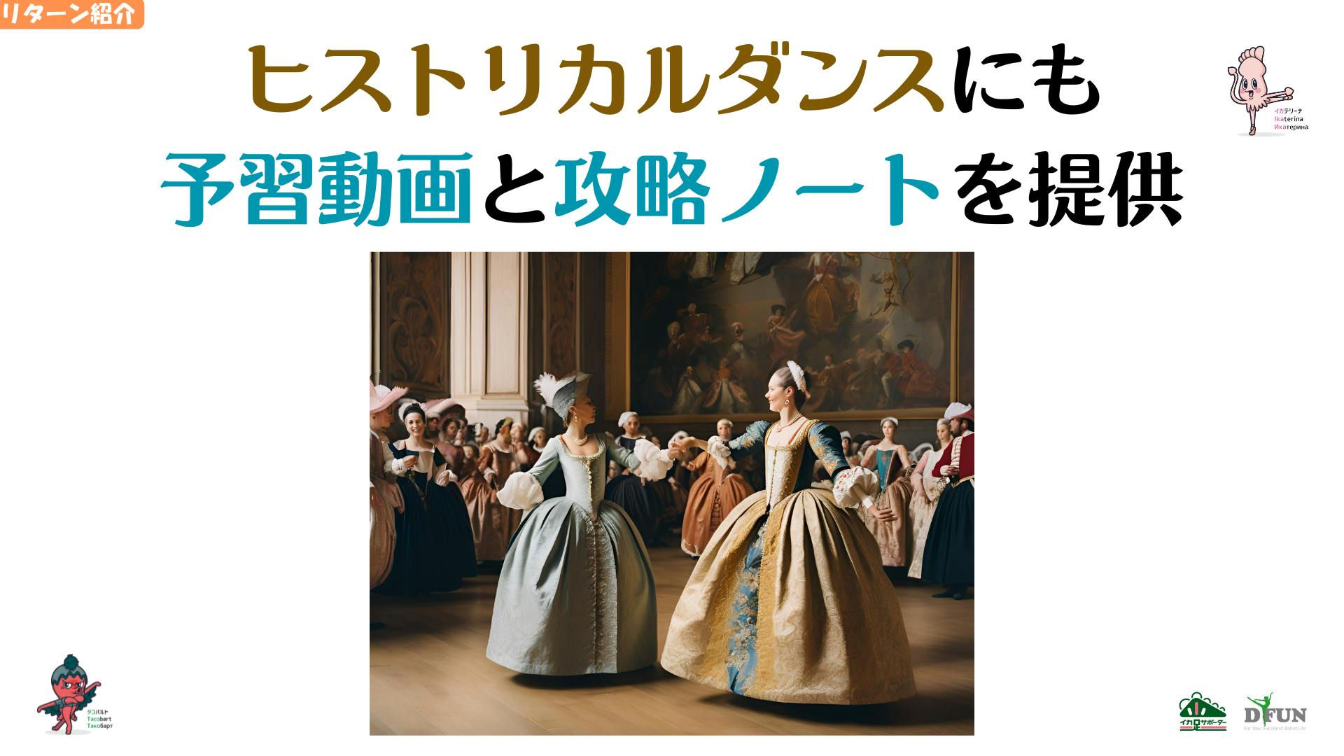 ・クラシックとヒストリカルダンスには、充実した予習動画と攻略ノートをご用意。事前準備で学びを最大化。