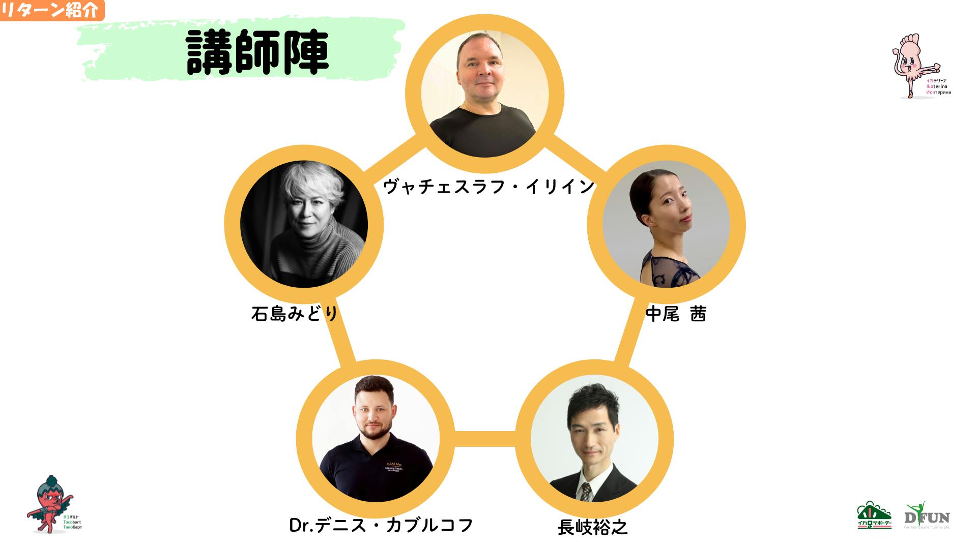 この3日間の特別講習会では、ロシアを代表するバレエ医師Dr.デニス・カブルコフによる最新の身体づくりクラスと、ワガノワ・バレエ・アカデミー教師課程を修了したヴャチェスラフ・イリイン先生によるクラシック及びヒストリカルダンスのクラスを開講します。さらに、ロシアバレエ教授法全8学年のディプロマを取得した石島みどり、中尾茜が教師またはアシスタントとして参加し、日本語での詳細な解説と正確なお手本で、本場の指導を分かりやすく、余すことなくお伝えします。