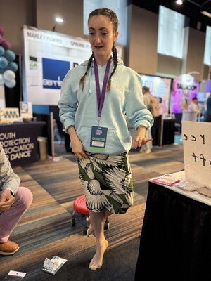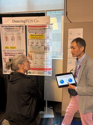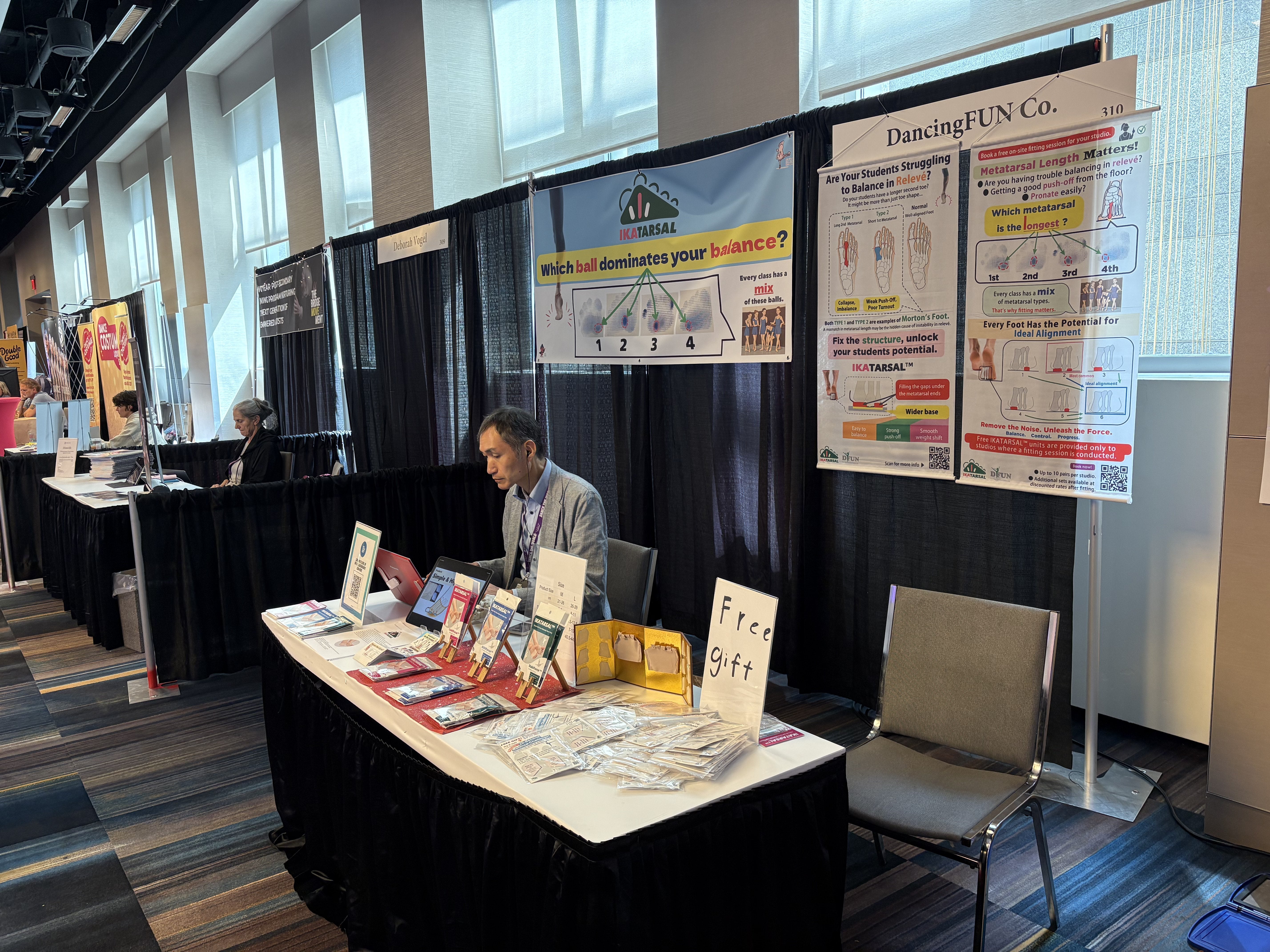 今回は「イカ足サポーター」のブースを、デボラさんの隣に配置させて頂きました。デボラさんご自身もイカ足に興味があり、 「ルルベの足底圧を測ってみたい」とのリクエストに応えて、測らせていただいた時の様子がこちらです。