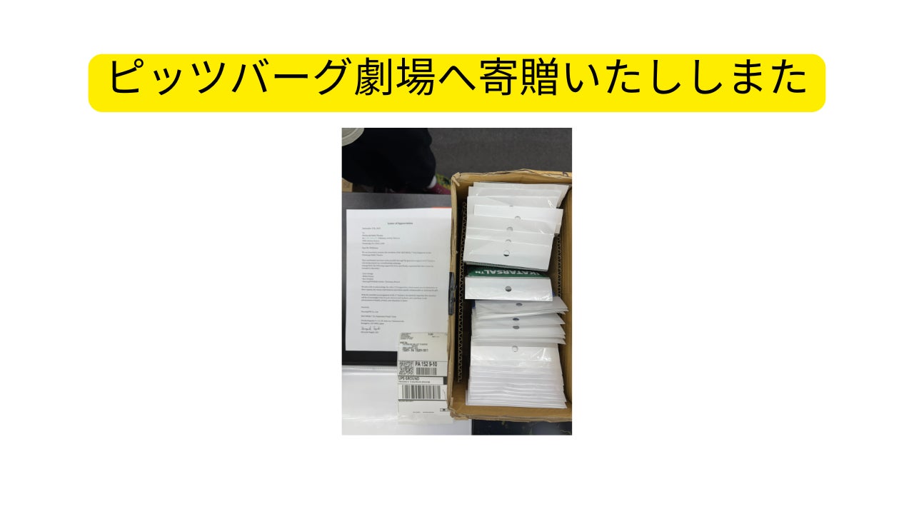 ご支援時に備考欄にご入力頂いた寄贈者名をローマ字表記にして印刷し、ピッツバーグ劇場への寄贈時に同封させていただきました。下記四名(団体)の方、こちらにも明記させていただきます。誠にありがとうございました。なお、その際に、支援者総数が117名であったことも添えさせていただきました。