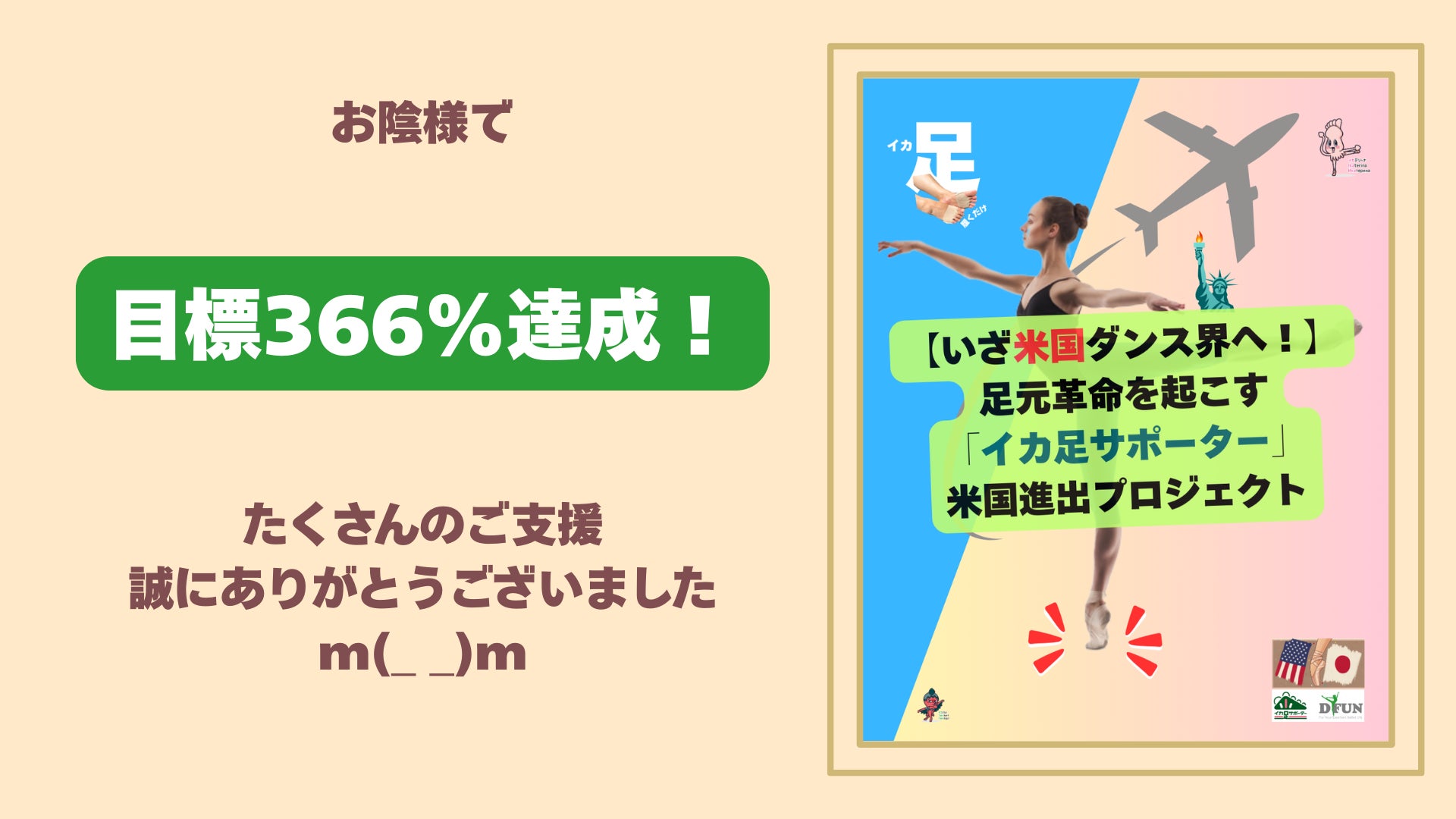 ダンスティーチャーサミット(Dance Teacher Summit)に参加してきました!結果報告お陰様で、ダンス教師とダンス教室経営者の方を中心に、米国の方たちに「イカ足サポーター」の存在を知っていただくことができました。m(_ _)mダンスに関しては、米国では、バレエ、ジャズ、タップなど複数のジャンルを教える教師や教室が一般的で、日本のように、特定のジャンルに特化していないのが普通です。その時点で、踊りに対する考え方が日本とは大きく違うのですが、幸い、「イカ足サポーター」はジャンルを問いません。今回は、ダンスだけでなく、スポーツ系の方や、高齢の女性にも体験していただけました。おそるおそるルルベしてみる体験者の様子NY NOWにてたまたま、ダンスティーチャーサミットの数日前に開催されていた、NY NOW(会場 Jacob Javits Convention Center)と言う、主にファッション系の日用雑貨展にも、出展させていただくことができました。そこではさまざまなジャンル、バックグラウンドの方に、試着体験をしていただけました。NY NOW会場入口こちらは、NY NOWで試着体験された方達の様子です。NY NOWにて体験された方たちの様子日本からの出展者さんたちにも大変好評で、展示会なので皆さん立ちっぱなしで足に来ていたこともあり、履いた直後の笑顔が笑顔を呼び、次々と「イカ足スマイルクラブ」のメンバーに。笑通りすがりの方達の中にも、足に問題を抱えている方が、少なからずいらっしゃったようで、試着している様子を目にして、「私も私も」と列ができるほど好評でした。「医者に匙を投げられている」と言う方も笑顔になり、「いったい何が起きてるの⁈」と知人にメッセージを送る人まで現れました。笑DTSにてこちらは、いよいよ本番、ダンスティーチャーサミットで、試着体験された方達の笑顔集です。笑ダンス教師・教室経営者の方々が、試着した直後の様子ピタリと合うと皆さん笑顔になるので、それを目安に微調整を行なっています。と言っても、6割の方は、袋から出して履いただけです。何も調整しないでこの笑顔です。勝手に「イカ足スマイルクラブ」を設立し、にわかメンバーになっていただきました。笑実際、笑顔になる方が増えるので、そんな形で社会貢献できたら素敵だな、と考えております。会場:ニューヨーク・ヒルトン・ミッドタウンDTSの会場は、ニューヨーク・ヒルトン・ミッドタウンです。ラジオシティ、MoMA、カーネギーホール、ロックフェラーセンターなど、超有名な建物に囲まれた場所にあります。ニューヨーク・ヒルトン・ミッドタウンデボラ・ボーゲル氏と『イメージ・筋肉調整法』、『ターンアウト』、『アラベスク』など、バレエ関連の教材を、以前日本語化させていただいた、米国ダンス教育界で神経・筋教育者として有名な、デボラ・ボーゲル氏と、2014年以来の再開となりました。今回は「イカ足サポーター」のブースを、デボラさんの隣に配置させて頂きました。デボラさんご自身もイカ足に興味があり、 「ルルベの足底圧を測ってみたい」とのリクエストに応えて、測らせていただいた時の様子がこちらです。デボラ・ボーゲル氏とイカ足について情報交換デボラさんの周辺ではすでに、「イカ足サポーター」を試験的に履いている方がいて、とても好評とのことです。デボラさんの専門は、神経・筋の教育です。「イカ足サポーター」で骨(構造)にアプローチできると面白い、ととても応援してくださっています。会場の様子ダンスティーチャーサミットの講義の様子を見て頂くとこんな感じです。講義の様子こういった部屋がいくつもあって、同時にさまざまなテーマで講義があったり、ダンスのレッスン(指導法)があったり、経営ノウハウなども学んでいます。部屋を一歩出ると、ベンダーが並んでいて、カペジオとか、ハーレクインとか有名ブランドが出展していました。ハーレクインが展示していた個人用のリノリウムが、当社のオンラインレッスンで使っているものと同じ物だったので「これ使ってますよ。」と話しかけたら、途端に親しくしてくれました。他には、米国で盛んなダンスコンペティションが多数、意外なところではダンス教室に特化した業務支援ソフトなども。当方が2014年に参加した際には、この手のソフトが四つ五つあったのですが、今回はその中でも老舗の「Jackrabbit Dance」だけが出展していました。こう言うサービスが事業として成り立つほど、ダンス市場が大きいと言うことの表れだと思います。カペジオとハーレクインそんな中にあって「イカ足サポーター」はかなり異色でした。機能特化していて、ふわっとしていないので、その分外れると大ゴケするリスクが高かった訳ですが、お陰様でそうはならなかったようです。当方のブース。隣はデボラ・ボーゲル氏「イカ足」と言う言葉や概念は、これまでなかったと思われます(当方が言い出しっぺなので)。一方で、「モートン足」と言う「第一中足骨が第二中足骨