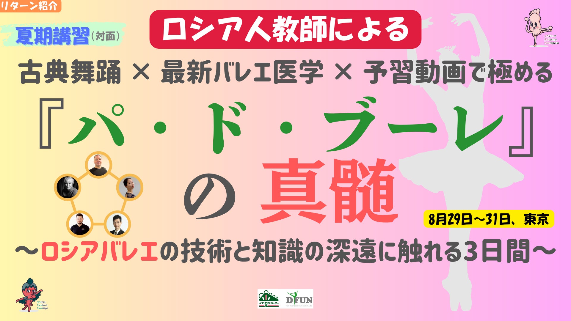 昨日、Dr.カブルコフからメッセージが届きました。今年のインストラクター養成講座を検討されている方向けです。ここをタップするとAIで作った日本語音声が聞けます。全文はこちらです。皆さん、こんにちは。デニス・カブルコフです。8月の終わりに、バレエにおける安全な発達について学ぶインストラクター向けのセミナーを開催します。これは毎年行っているセミナーで、指導力の向上や自己研鑽を目的としています。すべては子どもたちの安全な発達のためです。今年の8月は、3つの大きなテーマでセミナーを行います:身体の理解、脳の理解、そして足部の特徴とその発達方法です。私たちは、子どもたちを安全に発達させ、優れた成果を得るために、トレーニング機器の使い方を詳しく学びます。科学は毎年進歩しており、それに応じて教育システムも進化し続けています。今年は、バレエの身体と習慣の正しい形成に焦点を当てます。それは、解剖学と神経学のつながりでもあり、私はそれを誰にでもわかりやすい言葉で説明します。新しい知識は、子どもたちの発達をサポートする新たな方法を見つける助けとなるでしょう。私たちのエクササイズの効果は年々高まっています。なぜなら、最新の科学研究に基づいているからです。また特典として、安全かつ非常に効果的にストレッチを行える新しいトレーニング機器をお見せします。さらに、インストラクターをサポートするウェブサイトにて、年間を通じて機器の使い方に関する無料レッスンを提供していきます。原文はこちら。Всем привет, я Денис Каблуков.В конце августа я буду давать семинары для инструкторов по изучению безопасного развития в балете.Это ежегодные семинары позволяют повышать свою квалификацию и совершенствовать себя. Все это направлено на безопасное развитие детей. Этим августом будут три больших семинара по изучению тела, по изучению мозга и отдельно по особенностям стоп и как их развивать. Мы подробно разберем как использовать тренажеры, чтобы безопасно развивать детей и получать отличные результаты.Каждый год наука двигается вперед, мы совершенствуем и изменяем систему образования. В этом году мы сделаем акцент на правильном формировании балетного тела и балетных привычек. Это связь анатомии и неврологии, которую я объясню простым языком, доступным для каждого.Новые знания помогут вам находить новые способы развития детей. Эффективность упражнений растет с каждым годом, потому что наши знания основываются на самых новых научных исследованиях. Бонусом я покажу новый тренажер, который позволяет безопасно и очень эффективно выполнять упражнения на растяжку. А также мы создадим сайт поддержки инструкторов, на котором в течении года будем выкладывать бесплатные уроки по использованию тренажеров.Dr.カブルコフは、連日各地のバレエ団・学校や新体操チーム(ナショナルチームを含む)に出向いて身体づくりの指導をされています。その中で個別のコンサルテーションを行うこともあり、そこで「イカ足サポーター」を提供しています。評判が評判を呼び、スケジュールも過密になってきているとのことです。既に、バレエや新体操の枠を超えて影響を及ぼし始めている文字通り世界的権威です。超多忙なスケジュールを押さえて今回の3日間が開催されます。そんなDr.カブルコフから直接指導を受ける以上の学びがどこで得られるでしょうか?どうぞお役立て頂ければと存じます。クラウドファンディングは明日で終了となります。HEALMO関連のリターン《その他》足裏の感覚から変える!HEALMOバランストレーナー《その他》プリエは深く、ルルベは高く!HEALMOアンクルトレーナー《その他》HEALMOインストラクター養成講座《その他》HEALMOインストラクター養成講座3テーマセット《その他》ナショナルチームセット