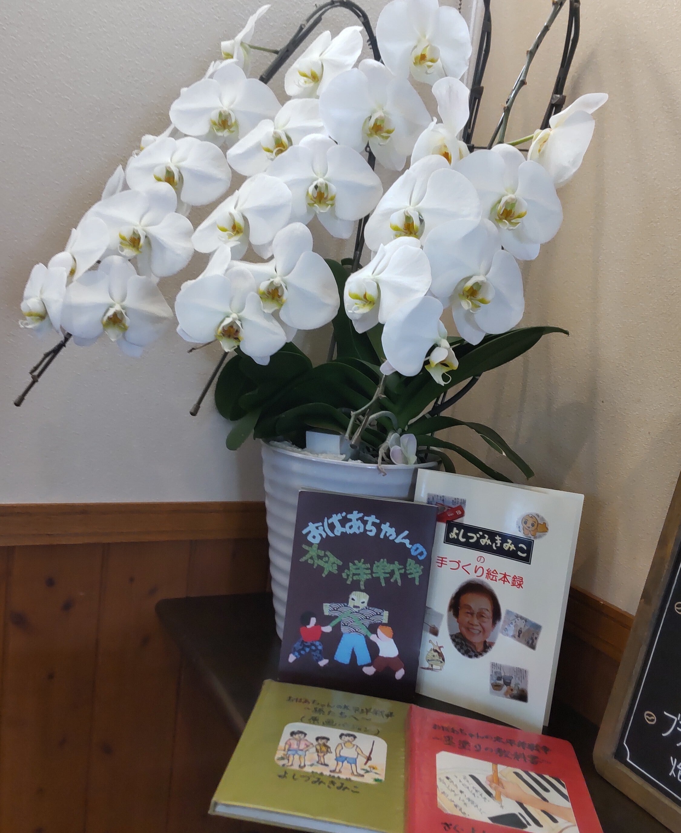 喜美子さんの同級生の方から胡蝶蘭のプレゼントがあり、今日、丹波篠山市の手づくり絵本展の会場へ届けました。