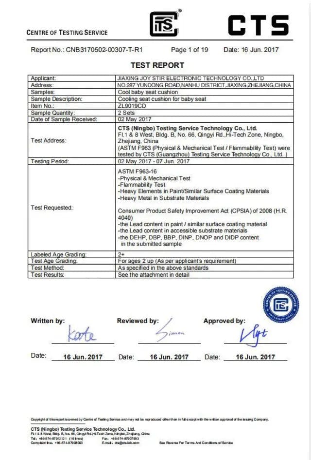 米国消費者製品安全委員会が認定する第三者機関による適合試験に合格し、商品が子供向け製品として安全に使用できることが立証されています。