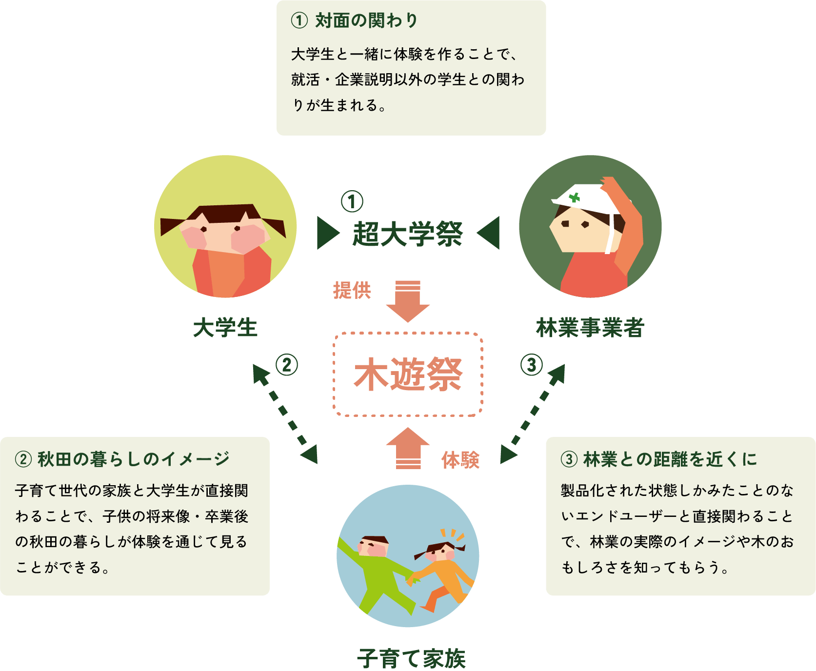 私たちが目指す木遊祭は、秋田の森が育んだ木々の温もりを感じながら、親子で思いっきり遊べる体験型イベントです。普段なかなか触れることのできない「木」とのふれあいの魅力を、木遊祭を通して実際に体験できる絶好のチャンスにしたいと考えています!