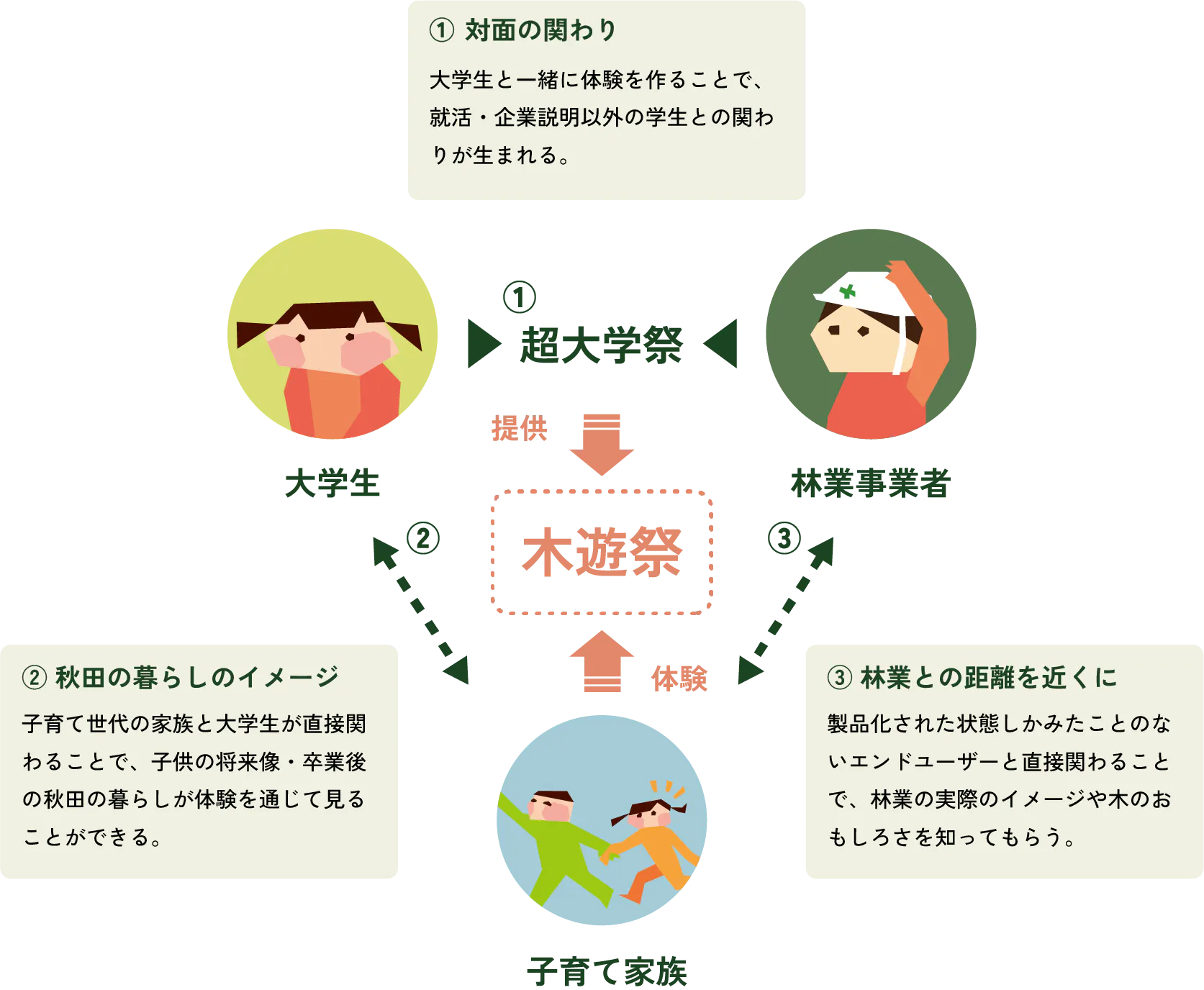 木遊祭では、大学生たちと木材関連事業者が共創し、林業の重要性を一緒に学びながら、地域との新たなつながりを育んでいきます。私たちの新しい視点と林業事業者の豊富な知識を掛け合わせて、親子が一緒に楽しめるイベントを実現させていきます!