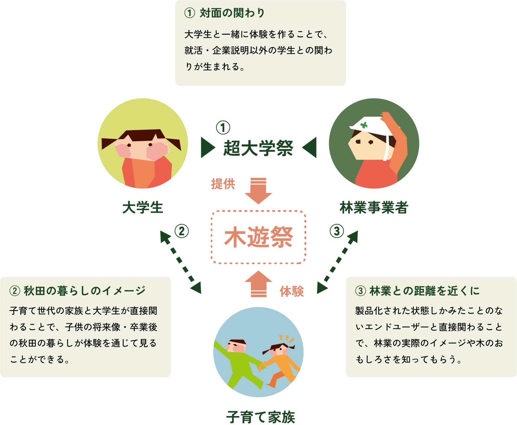 木遊祭では、大学生たちと木材関連事業者が共創し、林業の重要性を一緒に学びながら、地域との新たなつながりを育んでいきます。私たちの新しい視点と林業事業者の豊富な知識を掛け合わせて、親子が一緒に楽しめるイベントを実現させていきます!