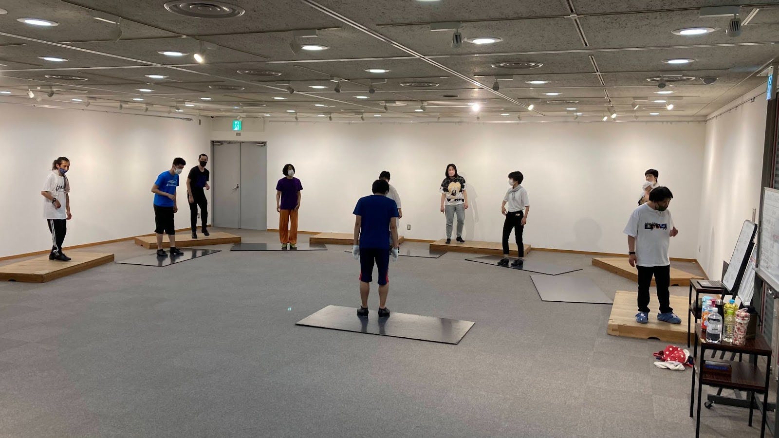 会場準備は常に全員で行います。各自が日付、会場、参加者についてノートに記入し、練習内容についてホワイトボードなどで確認します。