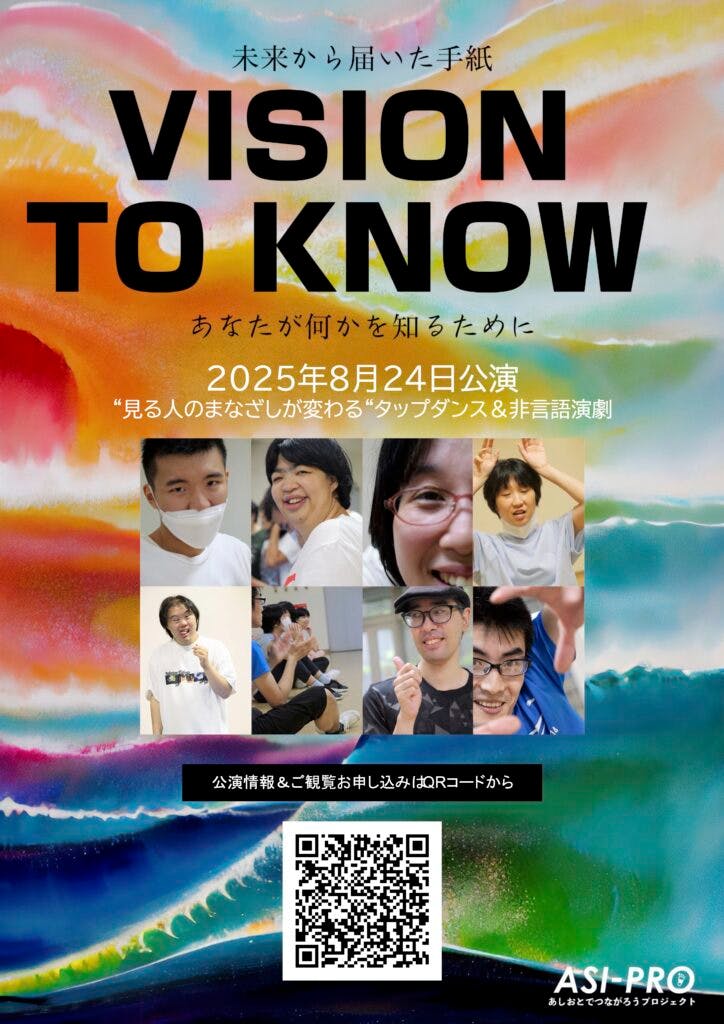 特性を強みに変えた”あしプロメッセンジャー”が非言語エチュードから関係性をつくり、映像空間で即興演劇を繰り広げます。タップダンスのコミュニケーションで気持ちを合わせ、ラストには手を差し伸べられた観客も全員舞台に上がり共に踊り合います。社会での立ち位置が逆転し、皆が楽しみ合う未来を体験できる公演です。