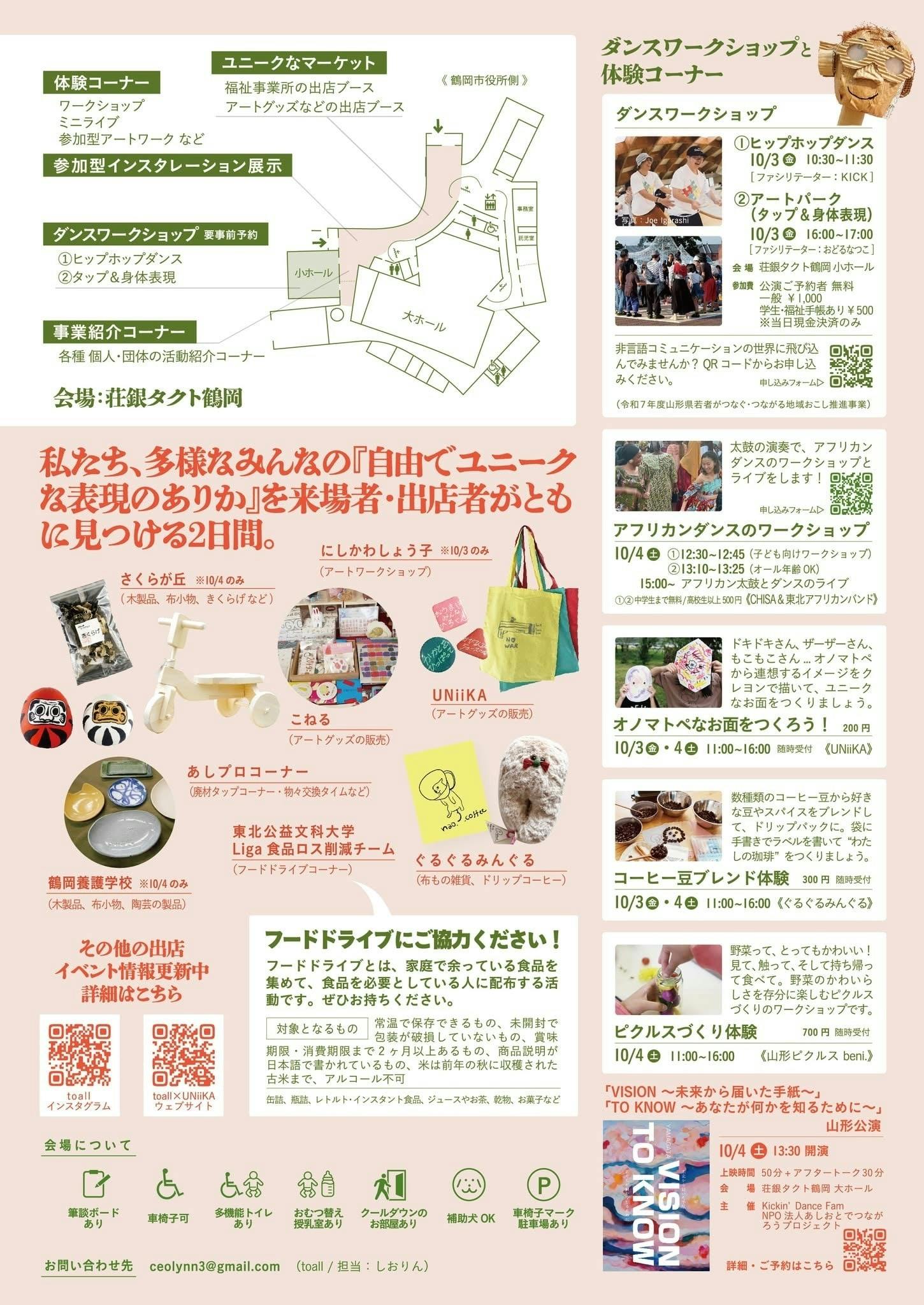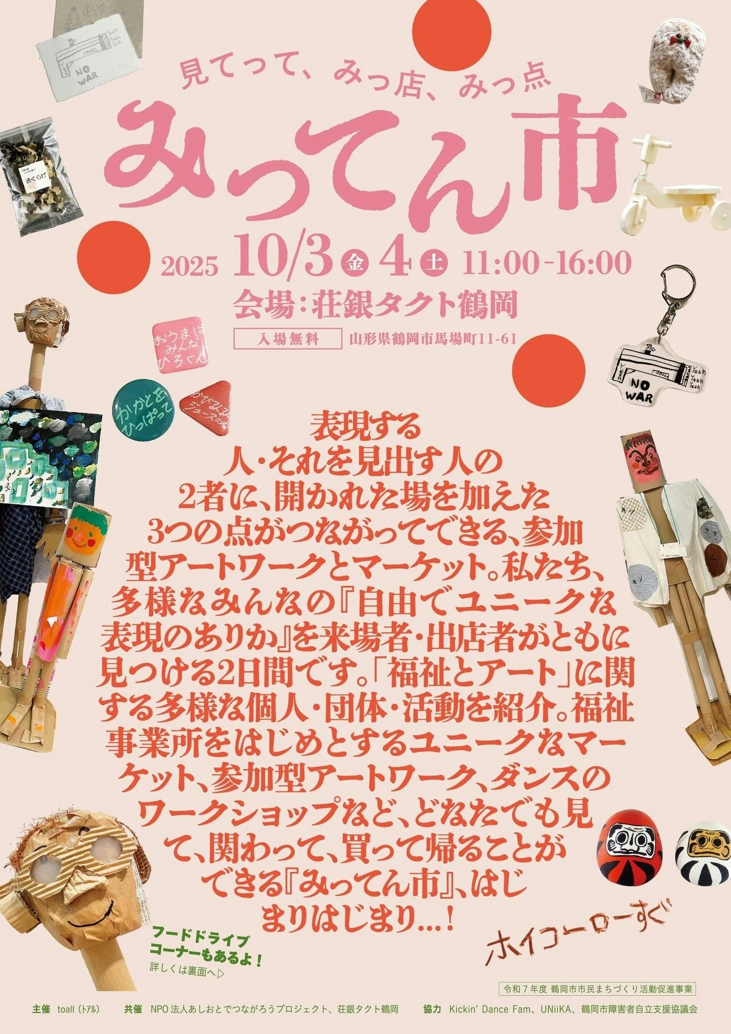 助成:令和7年度山形県若者がつなぐ・つながる地域おこし推進事業(ワークショップ)・令和7年度鶴岡市市民まちづくり活動促進事業(みってん市)