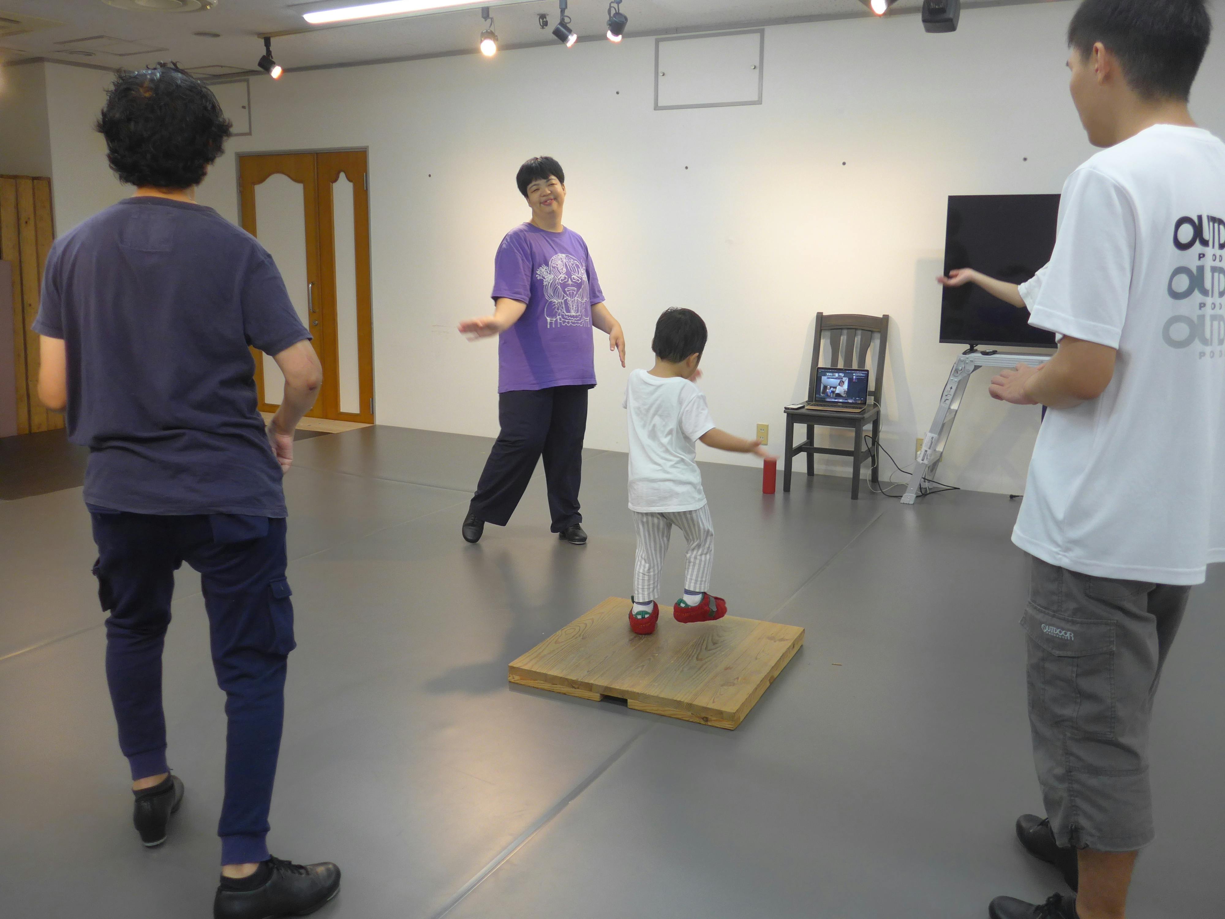 お盆の関係で先週に続いてのアートパーク開催でした。 私たちが活動しているフジサワ名店ビル6階では、現在松本大洋氏のパネル展も行われています。展示は8/19までとのこと、ぜひお立ち寄りください。今日は8/24公演前ラストのアートパークとなるため、総合演出の塩田も加わり、表現をお客様にいかに届けるかについて、意識的に取り組みました。遠くの人と一つの表現を作ったり、一つの表現を多くの人で増幅したり。空間内のコミュニケーションの輪を大きくしていく中で、大きく動いて疲れたら、止まったまま表現し続けられないか?など、試していきました。明確な提案によって、メッセンジャーたちはのびのび安心して動けます。そして、「みてもらいたい」という気持ちが溢れてくる。その後に行った、方法を提示せず、音楽を聴いて自由に踊ってみるといういつも盛り上がるコーナーでは、「みられている」という緊張が生まれたのかセンターが空きがちだったのが印象に残りました。自分で考えた表現を、人前でトライすることには緊張が伴うものなんだ、ということを思い出させられます。アートパークがいつもの仲間だけではなく、さまざまな人が参加する場になっていくことで、そんな小さな緊張をお互いに乗り越える機会も増えるように思います。多くの方のご参加をお待ちしております!次回アートパークは9/14(日)→詳細リンク参加申し込みはこちらから→参加申込フォーム概要日時:8/3(日)9:55〜12:30会場:フジサワ名店ビル6階スタジオ参加者:あべっち・じぬっち・Jimmy・みのり・あっくん・ちさどん・塩田・なつこzoom:プーさん・ともみ・洋一タイムスケジュール9:55 JR藤沢駅改札集合10:00〜 開場、ミーティング10:25〜 ストレッチ・コミュニケーションゲーム(鏡・鳥・森・石)動物クイズ(海の中の魚ほか)・マスゲーム(全員で一つの表現を作る)・カオスゲーム(言葉のお題を各自が解釈して表現する)11:30〜休憩11:40〜タップセッション(基礎だと思う使い方・感情(笑)・音楽でフリーセッション「ドッペルゲンガー」「ダンスホール」・リズムサークル12:25〜 そうじ・振り返り12:50 終了 希望者は名店ビルツアー(買い物)とお昼ご飯13:50 解散参加者感想・マスカオスゲームを久々にやって楽しかったです。ぶたいこうえんで、おきゃくさんたちとセッションしてみたいです。・ジミーのひょうげんが大きくうごけていて良かった。ソロをやってみたい。・かがみ(を)ひとで(やったことがおもしろかった)。森、うみ、タップダンス、ソロダンス(を)やりたいイベント(で)・あべっちのニワトリがかわいかった。こんごみんなでたのしいこうえんにしたい。スタッフ振り返り・連絡ミスとwifiの不調が重なり、遠隔メンバーがなかなかzoomに入れず開始が遅れた。・最初お喋りが多かった。スタッフもお喋りするタイミングとそうでない時の話し方のモードを分ける必要がある。・プログラムや表現の課題へのトライにも、集中して大きく身体を使えた。そのためか、終了後「疲れた」との声も多かった。・表現の中での「身体の休め方」へのトライは、本番中無意識にやっていたことを意識化できて良かった。・総合演出がいることで、どうみられるか緊張したのか、方向を示されていないフリーセッションの時、センターに出ない傾向があった。