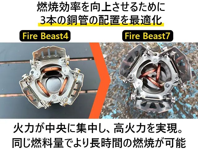「Fire Beast7」と「Fire Beast4」の大きな違いの一つは、内部銅管の配置位置にあります。