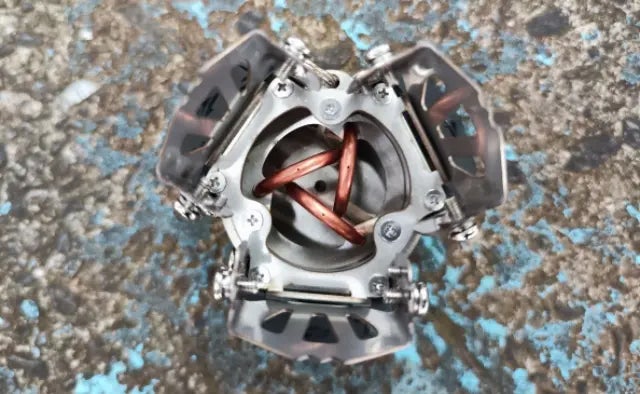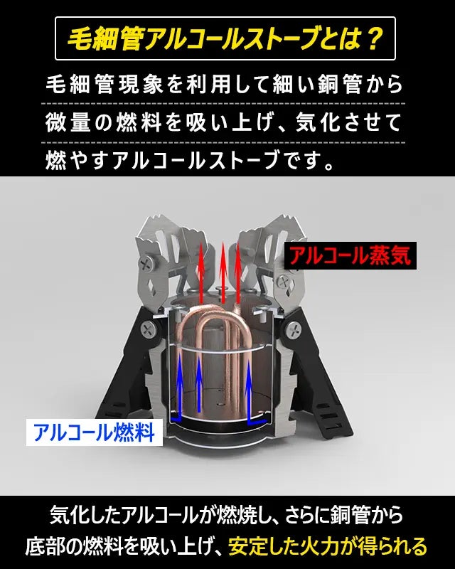 アルコールストーブ「Fire Beast7」では、燃焼タンク内部に固定された三本の細い銅管が、毛細管現象を利用して、アルコールを底部から上部へ吸い上げ、効率的に燃料を供給します。