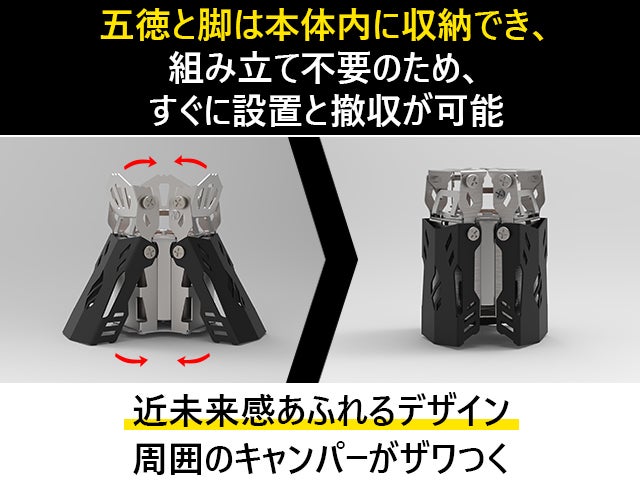 A:一体型で組み立てが不要な構造になっております。折り畳み式で展開可能な固定脚や五徳付きの構造を採用し、持ち運ぶ時もスペースをとりません。