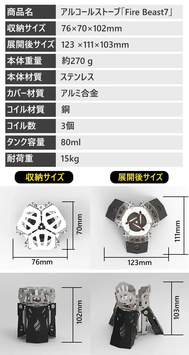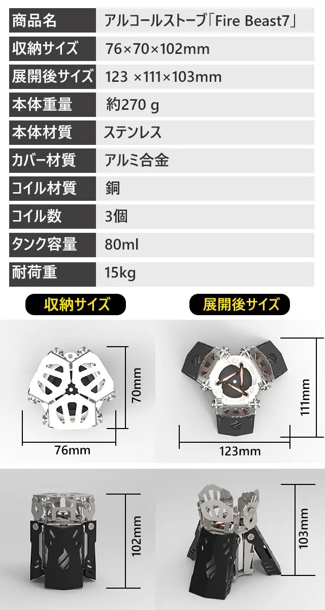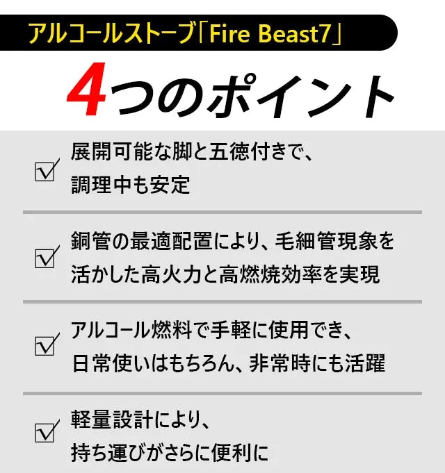 「Fire Beast7」は、アルコール燃料を使用し、安定した高火力を長時間提供するストーブです。