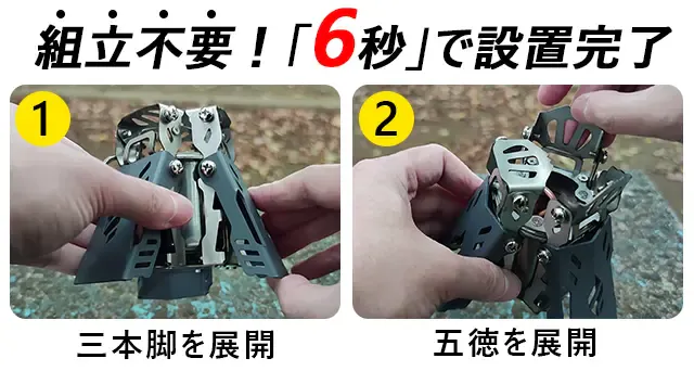 展開式の五徳と脚付きの一体型デザインで、組み立ては不要。