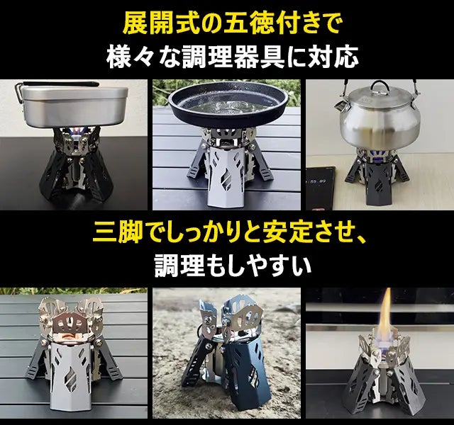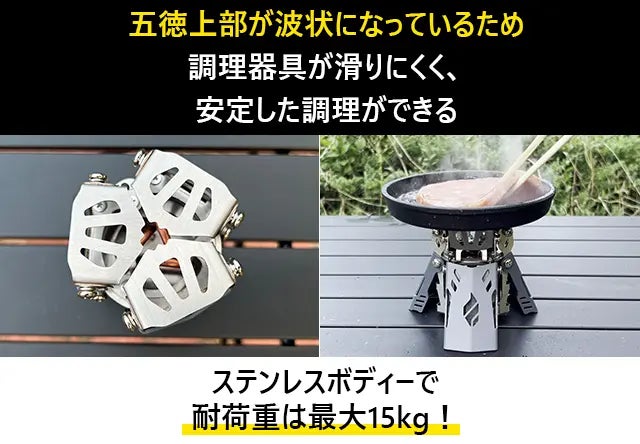 また、五徳自体が風防の役割も果たし、風の影響を抑えて効率的に調理が可能です。
