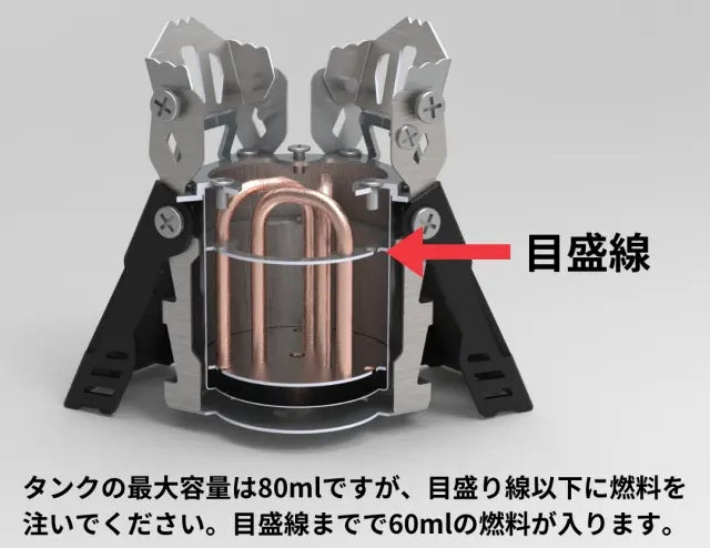 タンク内には燃料目盛線としての金属リング付きで、多量にアルコールを注ぐ心配がありません。