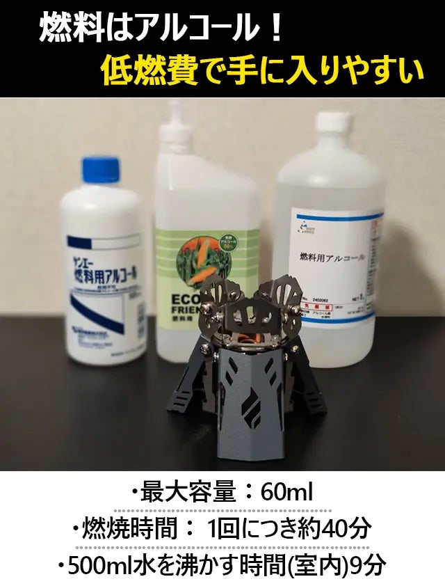 ※60mlのアルコール燃料を使用すると、約40分間の燃焼が可能です。