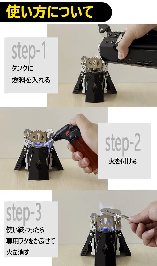 A : アルコールストーブを点火する前に、周囲に燃えやすいものがないことを確認してください。アルコールをアルコールストーブの中に注ぎ、ライターまたはマッチを使用して点火します。点火した後は、アルコールストーブの周囲に十分な空間を確保してください。