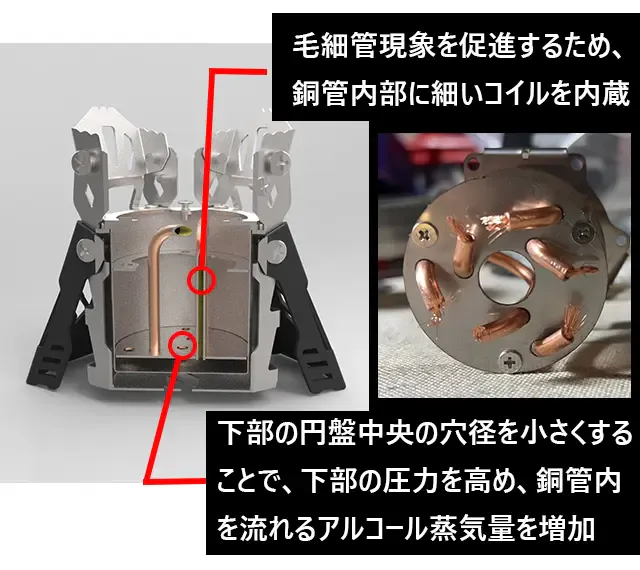 銅管内のアルコールが加熱されて気化し、その気化したアルコールが穴から噴出することで、ブレのない火力を実現しています。