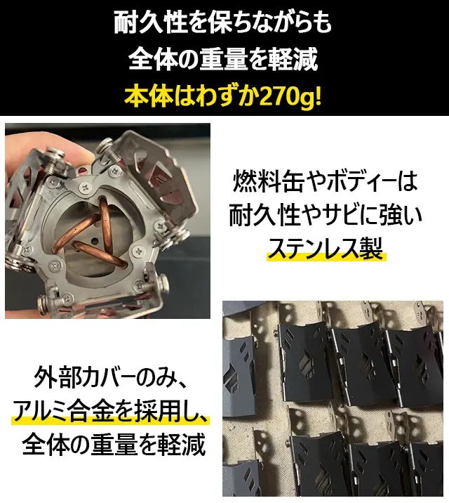 燃焼効率を向上させるため、3本の銅管の配置を最適化しました。さらに、各銅管内部に細いコイルを内蔵することで、毛細管現象をより効果的に活用し、安定した高火力を実現しています。これにより、アウトドアでの調理がより快適になりました。