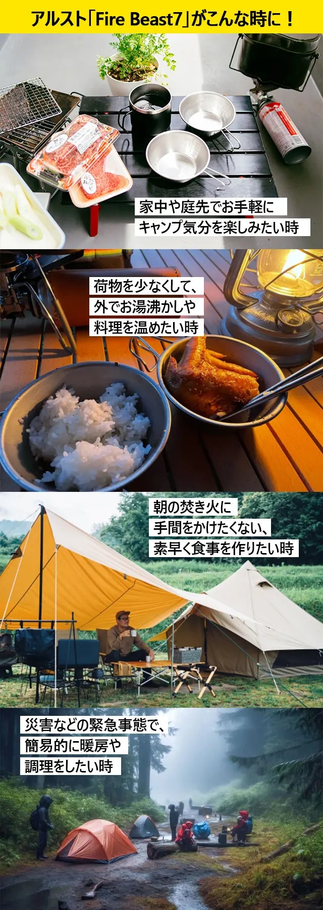 アウトドアやおうちキャンプ、読書を楽しむ際のリラックスタイム、ベランピングやカフェ気分を味わいながらの食事、さらには晩酌のシーンまで、アルコールストーブ「Fire Beast7」があればさまざまなシーンで楽しさが広がります!