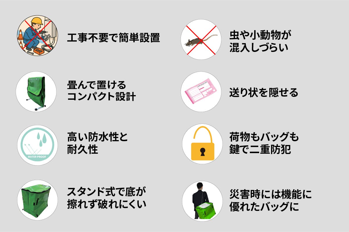 ホームセグリは圧倒的な「安全性」と「利便性」を持ち合わせおります。盗難、異物混入、雨被害などのトラブルから荷物を守り、工事が不要でコンパクトに畳んでおくことができます。