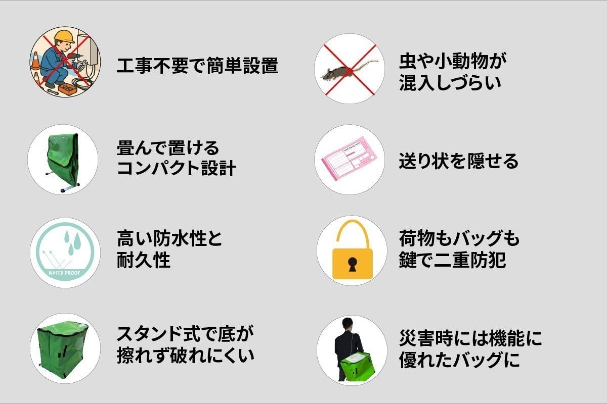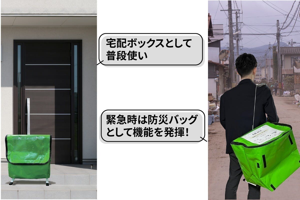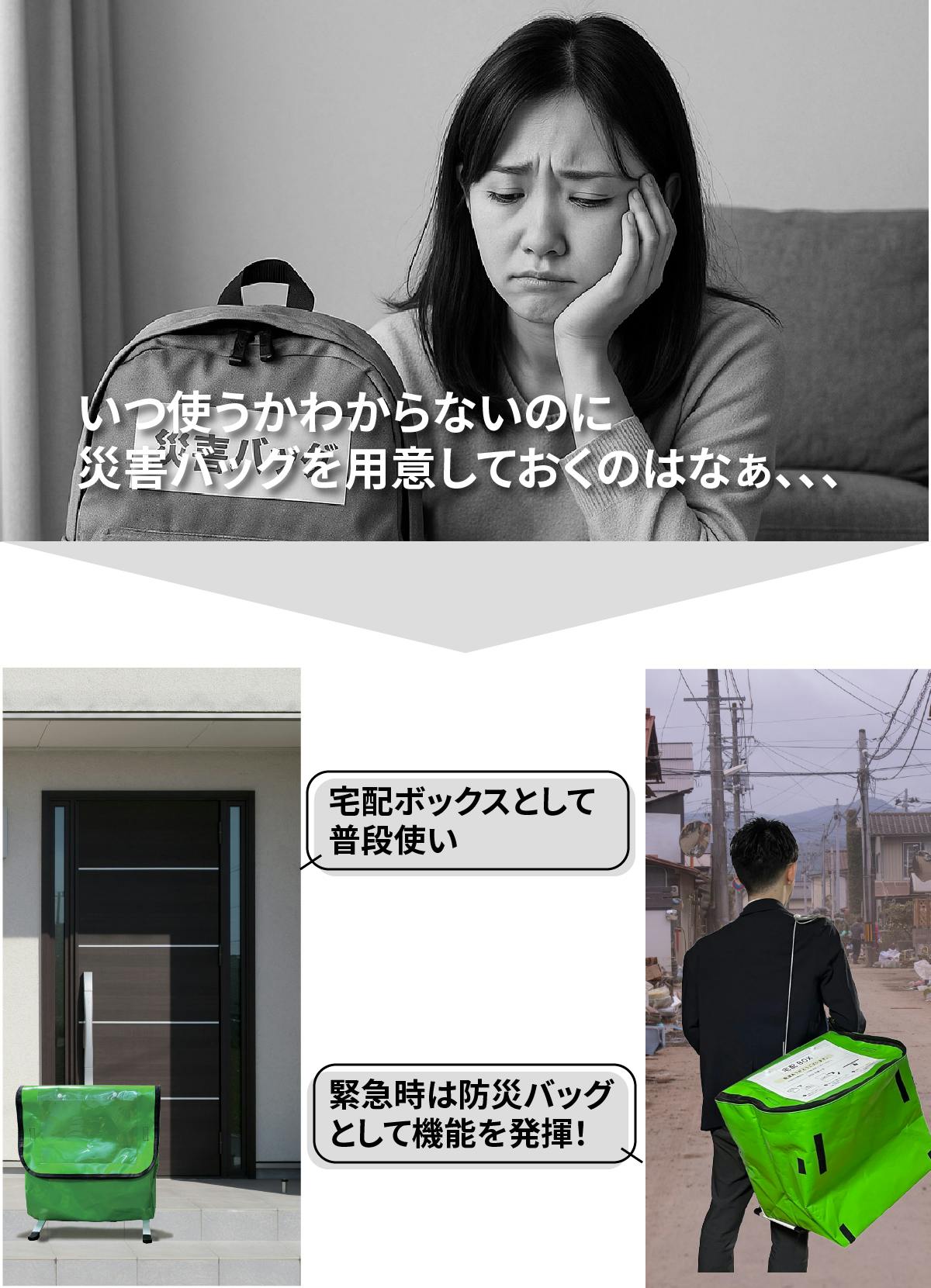 災害と常に隣り合わせの日本。そして2024年から続く置き配問題。これらを解決すべく、日常使いは宅配バッグとして、緊急時には防災バッグとして活用できる製品を作りました。