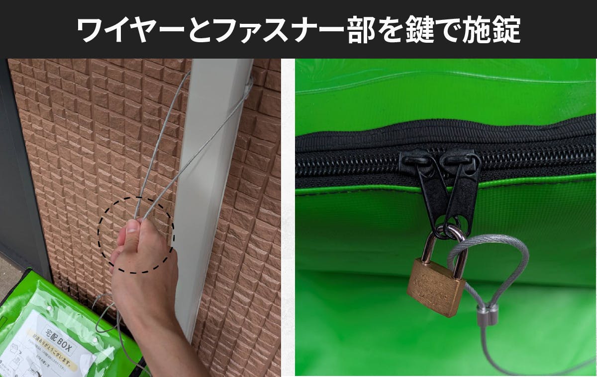 ホームセグリーはチャック部分を南京錠で閉めることができるので中身を盗難されるのを防げます。