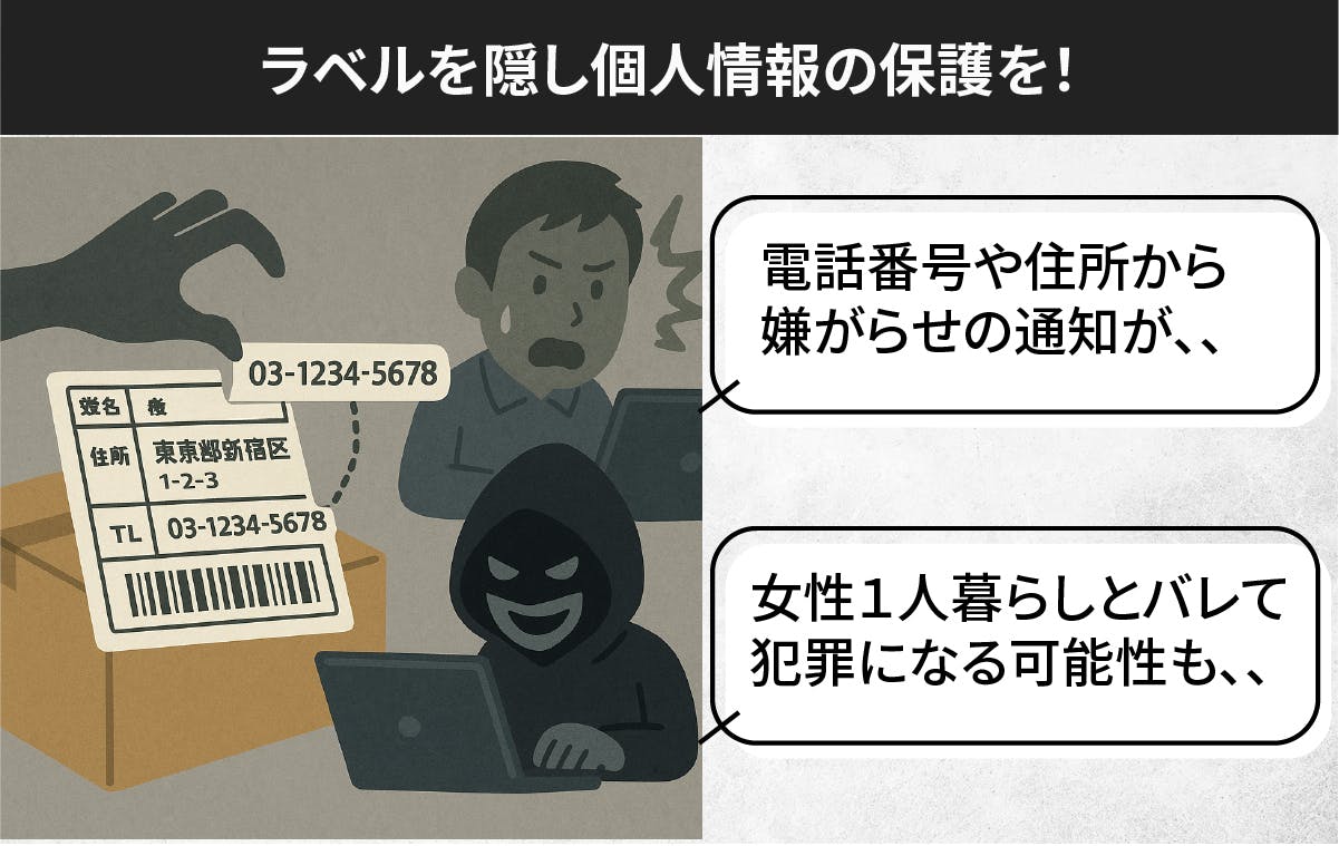 荷物をそのまま外に置かれると名前や内容物がラベルから見られる可能性があります。名前や内容物から、「この家には女性が住んでいる」と思われたり、個人情報まで特定されてしまい犯罪に巻き込まれるリスクもあります。