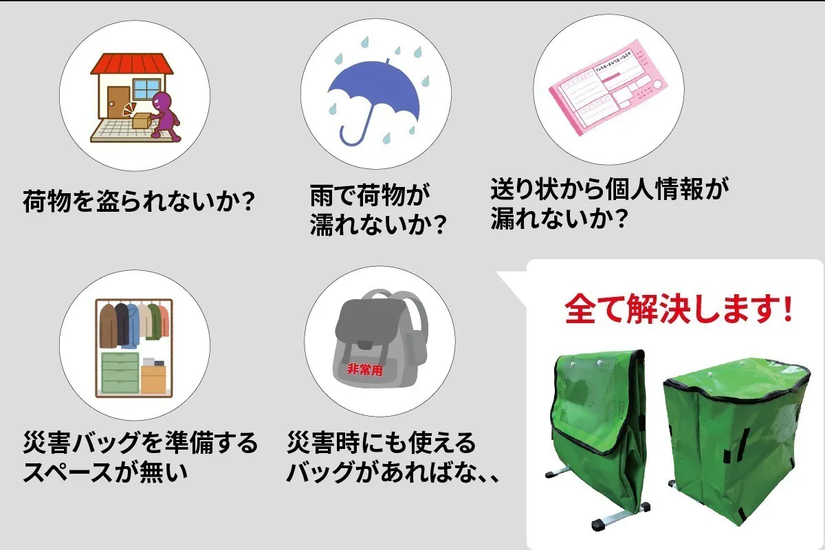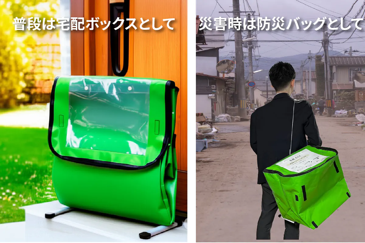 災害と常に隣り合わせの日本。そして2024年から続く置き配問題。これらを解決すべく、日常使いは宅配バッグとして、緊急時には防災バッグとして活用できる製品を作りました。