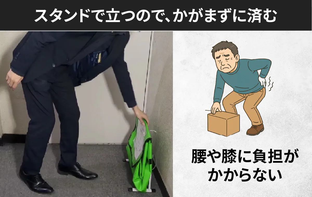 また腰や膝に不安がある方にとって、床に荷物があるとかがむ必要があり負担がかかりますが、スタンドで立っているため、立ったまま楽に取り出しが可能です。