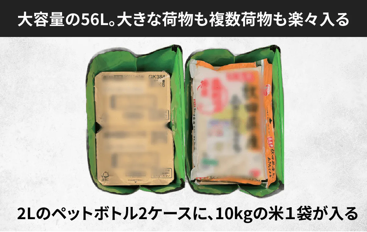 ホームセグリは56Lの収納量を持ち、2Lペットボトル6本に、10kgのお米が1袋入るほどの大きさです。