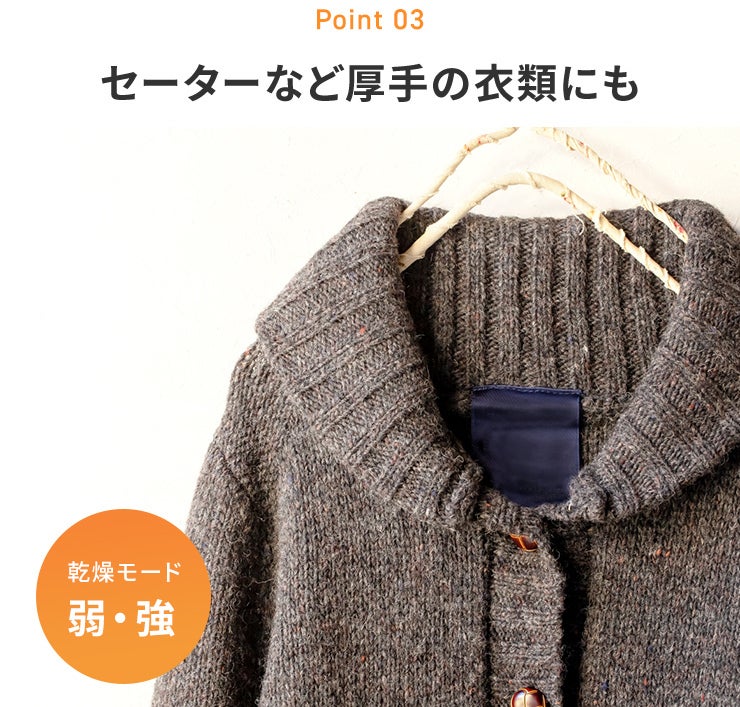 乾燥モード「強」を選択することで、スウェットやセーターなど厚手の衣類もスピーディーに乾かすことができます。